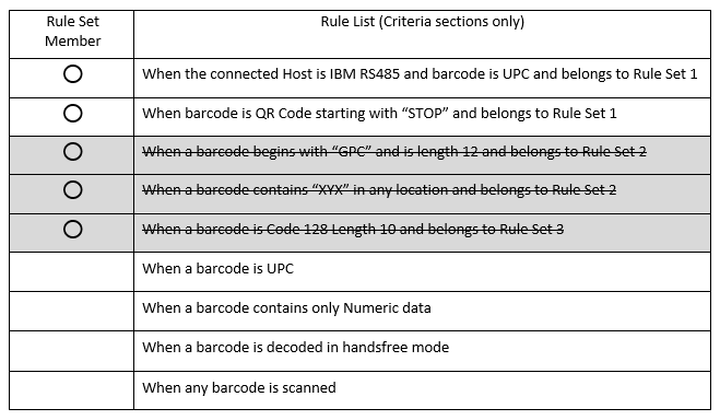 This can be useful if the scanner is used in two different locations in the business. Fox example, the Back Room will connect the scanner using an RS232 connection, and the Retail checkout lanes use a USB SNAPI connection. The scanner can be set to enable Rule Set 1 when RS232 is connected, and Rule Set 2 when USB SNAPI is connected.