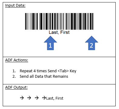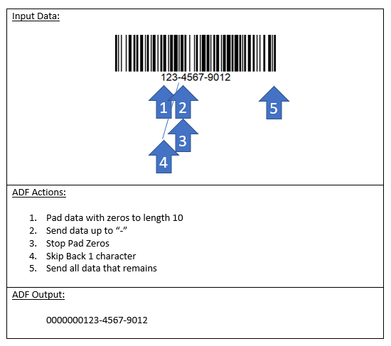 The ADF Interpreter’s main function is to use rules to process the scanned bar code data in an input buffer and to move selected data to an output buffer. Each rule has a “criteria” section that describes the requirements for the rule to apply. If the rule applies, the rule’s list of actions is used to process the input buffer’s data. The results of the rule’s actions are stored in an output buffer. This output buffer data is transferred to the connected host device.