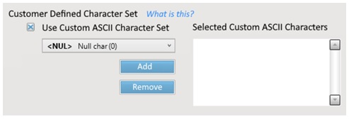 ADF has a powerful filtering feature that can screen through barcode data to eliminate it, or to match barcodes that have it. A rule can have a Custom Set of characters defined to be referenced within the rule. The General Settings section of the rule has a place to setup this list. Up to 16 characters can be selected.