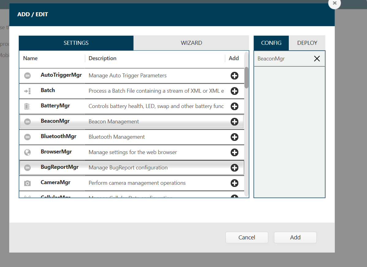 5. Find BeaconMgr and click the plus (+) sign next to it. This adds BeaconMgr to the Config tab on the right side. Add config setting