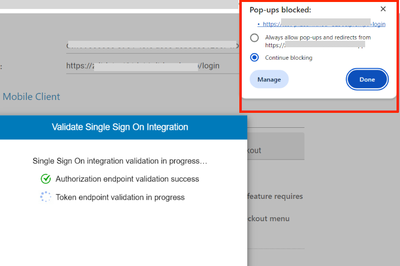 If nothing occurs after clicking on the Validate button when integrating SSO, check whether the pop-up blocker appears in your browser. If so, allow pop-ups and perform the validation again. Enter your SSO login credentials when prompted, then a message appears prompting to proceed with SSO activation.