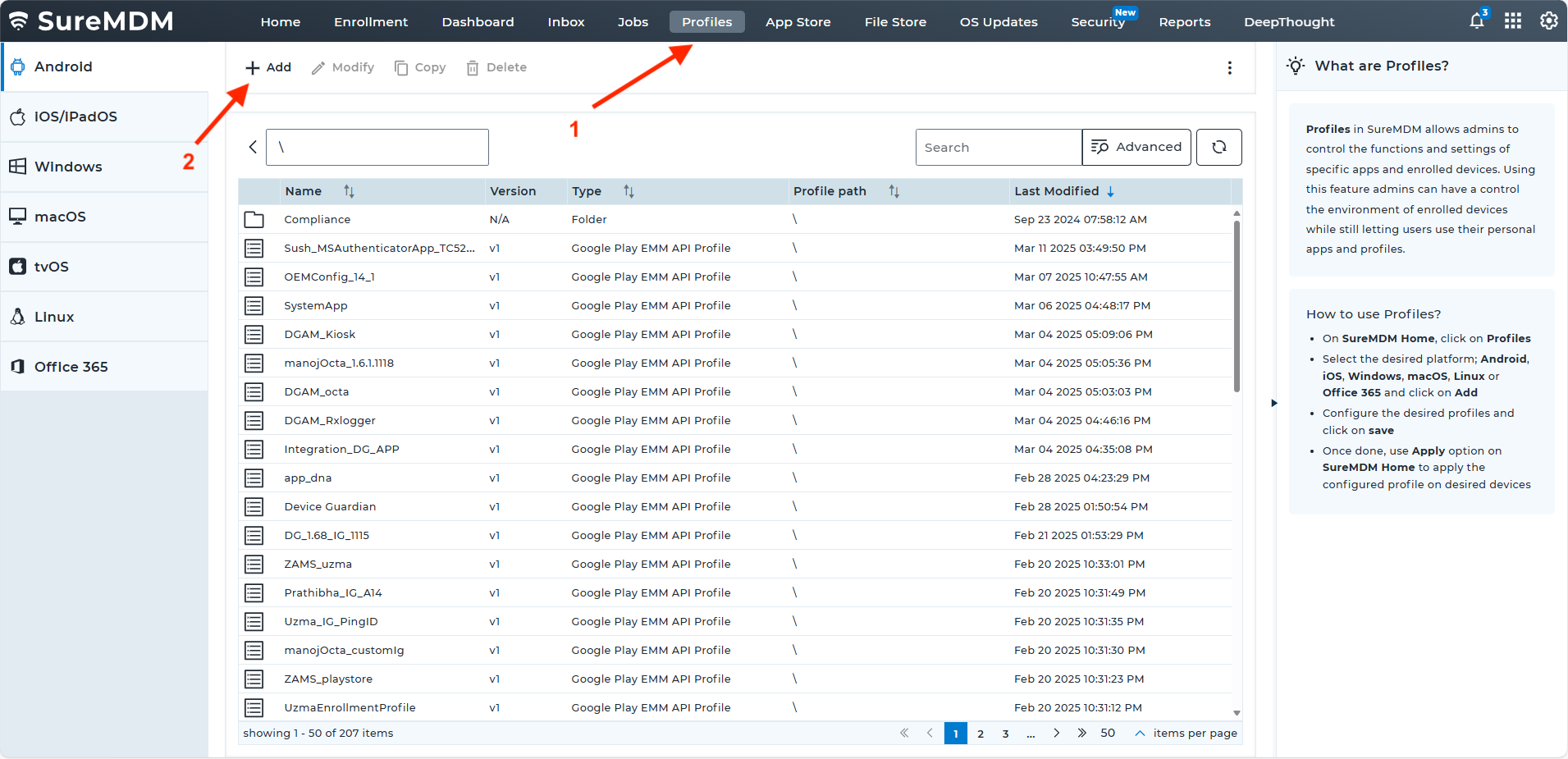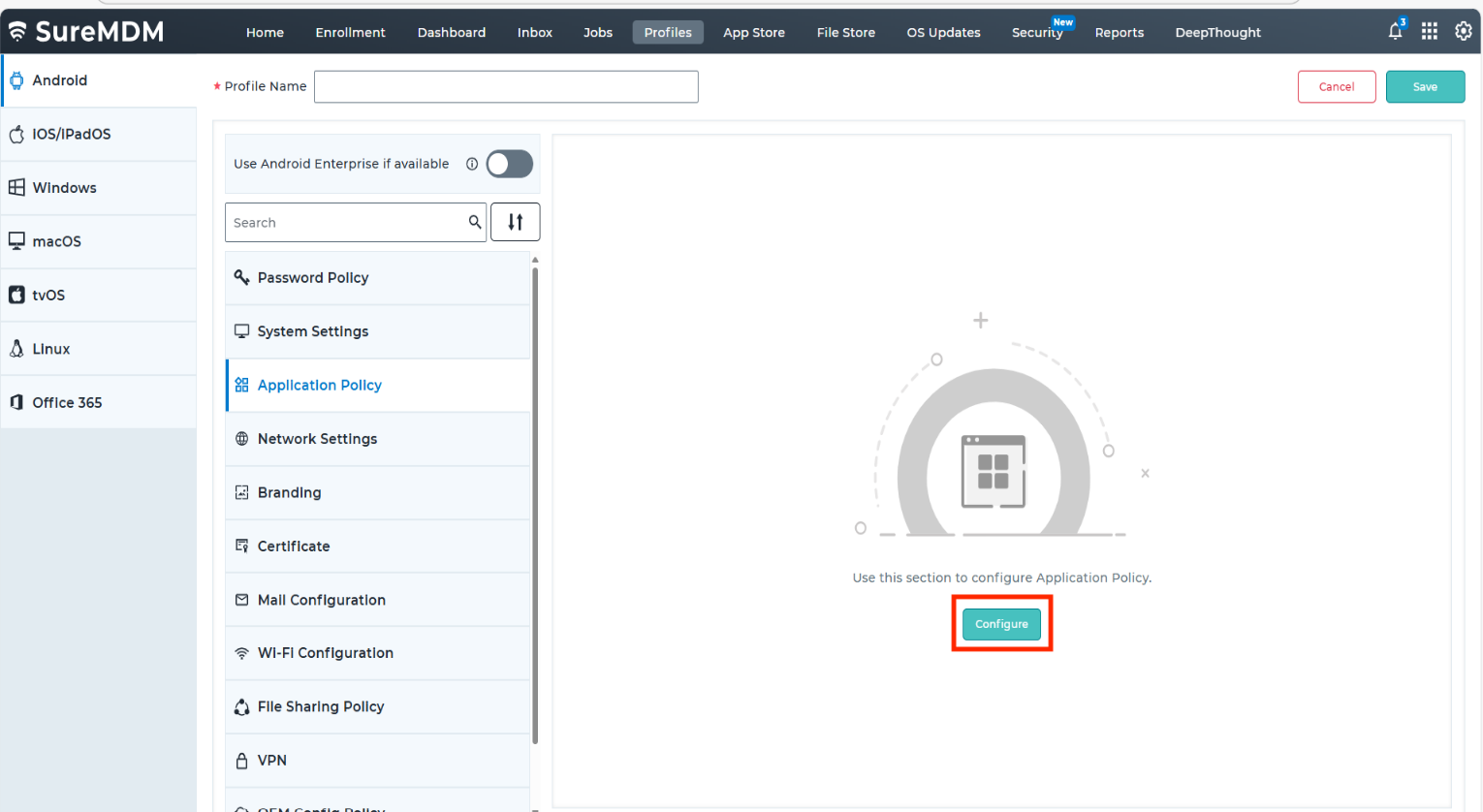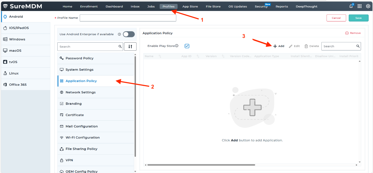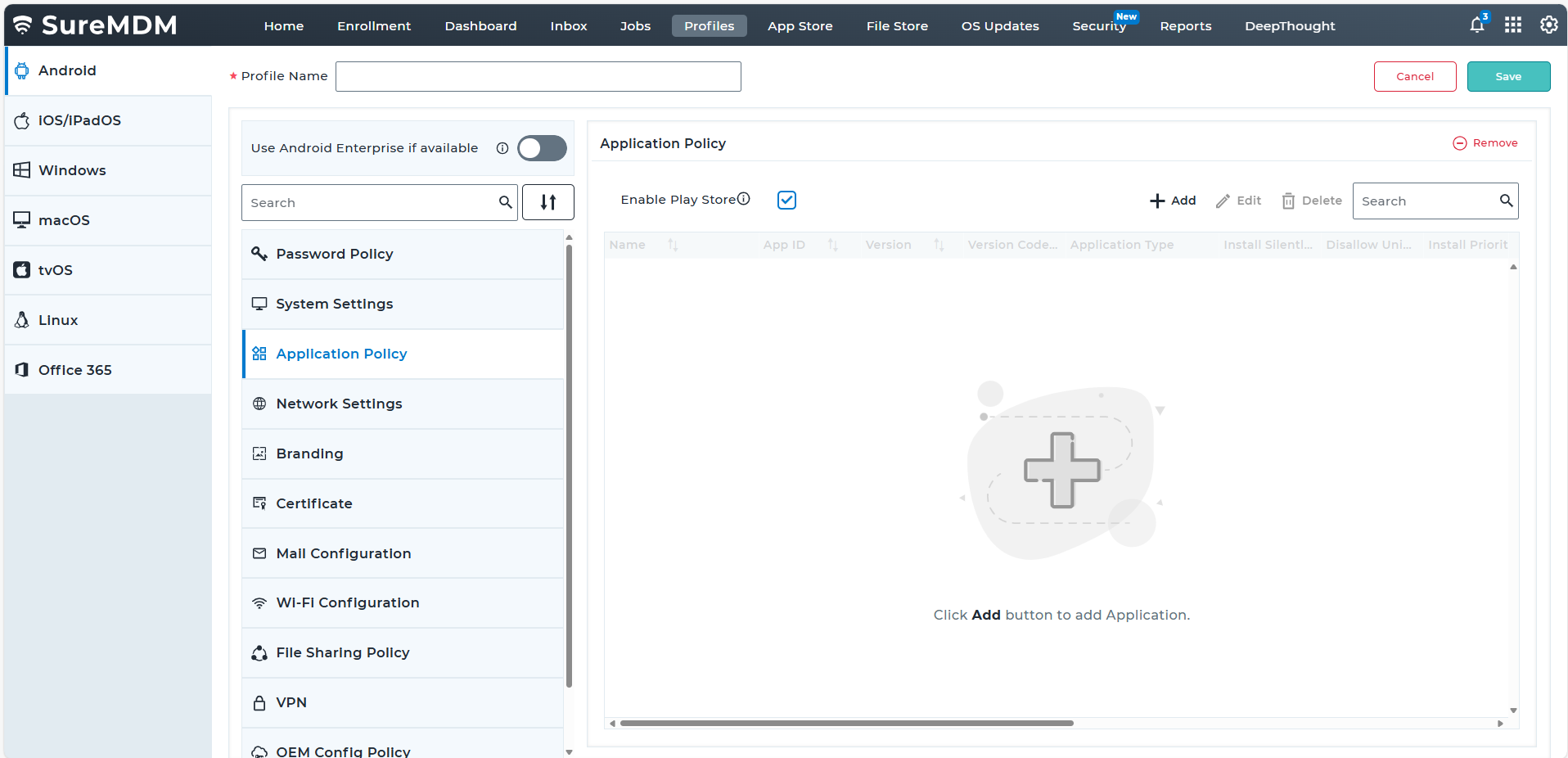- In the 42Gears SureMDM web console, click on Profiles > Application Policy and click Add.