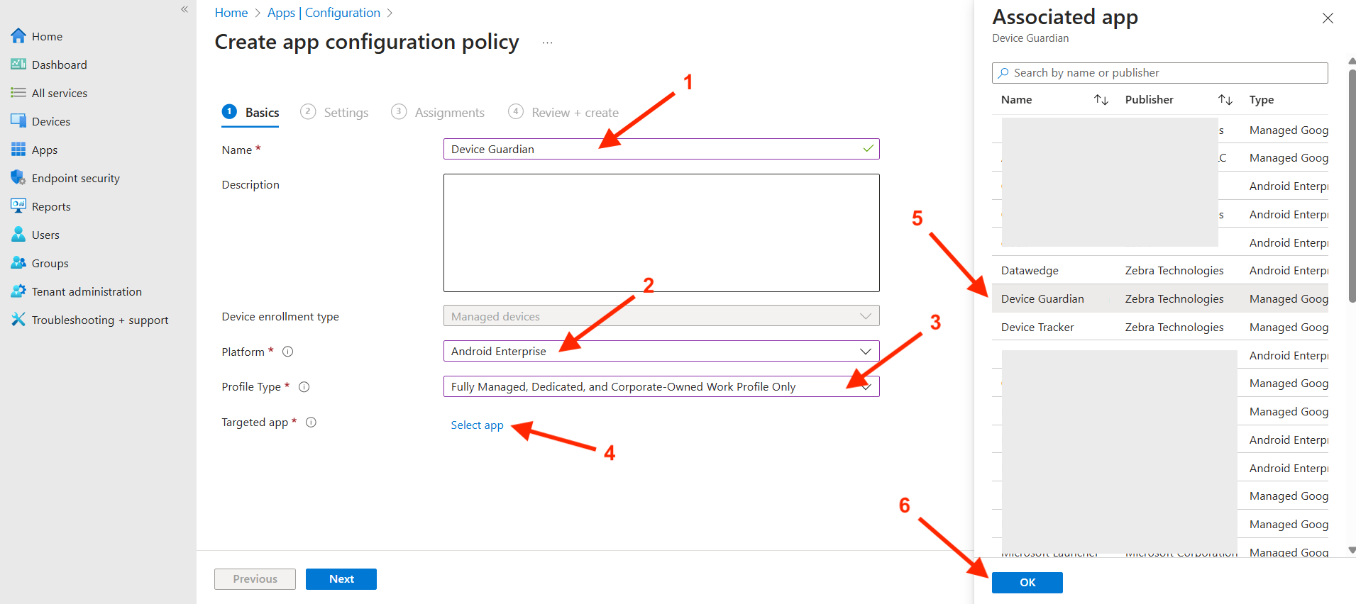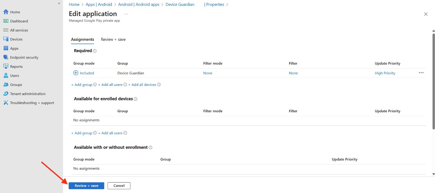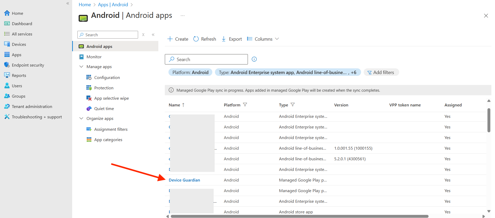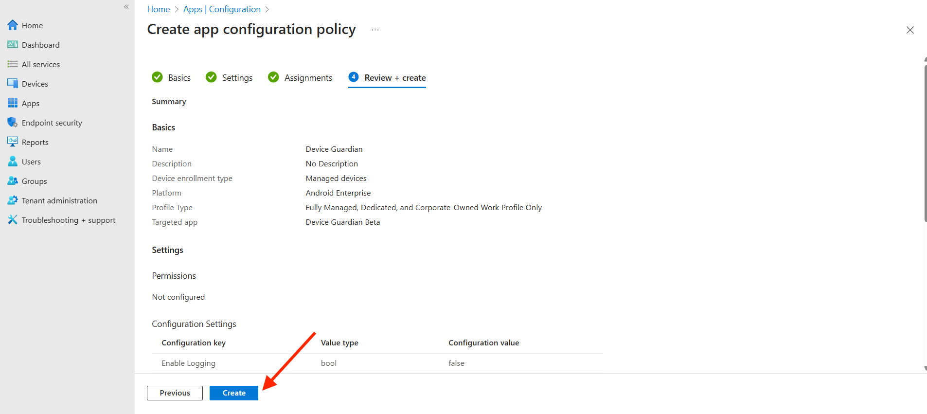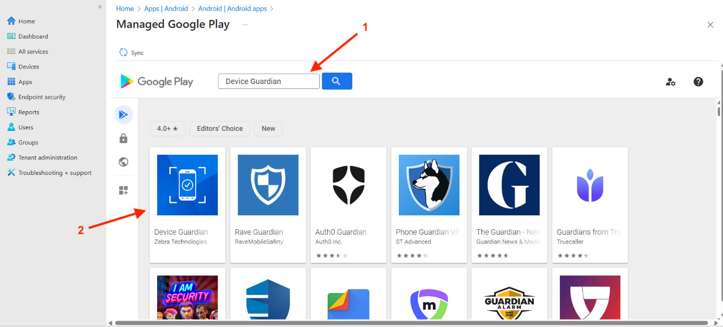 Follow these steps to use Microsoft Intune to install Device Guardian from the Google Play Store and apply a policy that enrolls the device with the Device Guardian server.