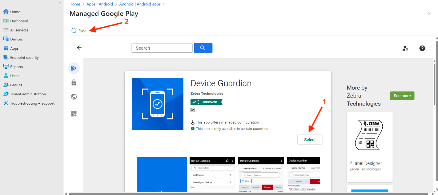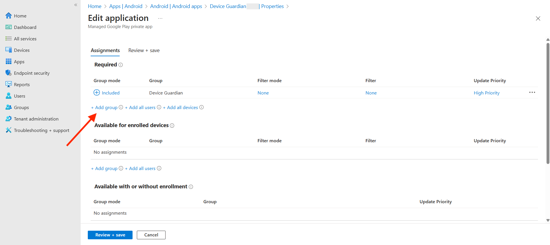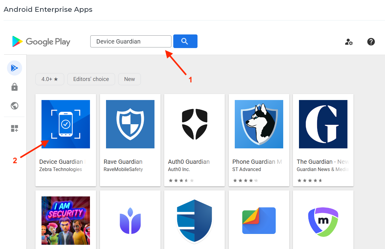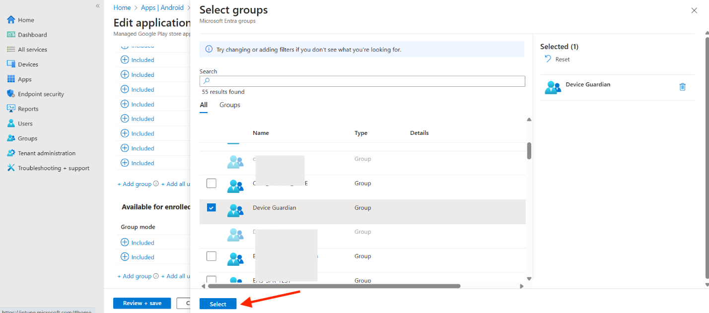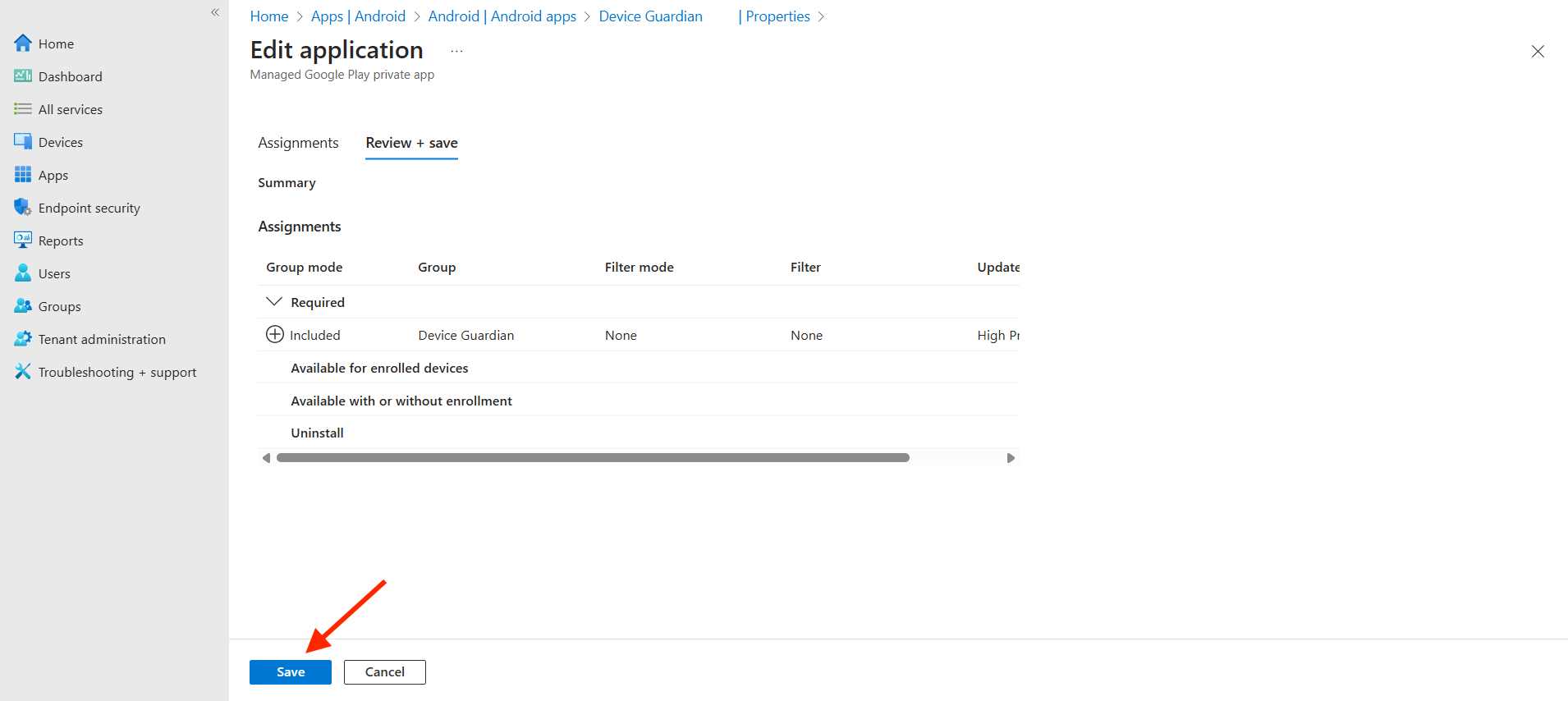 Follow these steps to use Microsoft Intune to install Device Guardian from the Google Play Store and apply a policy that enrolls the device with the Device Guardian server.