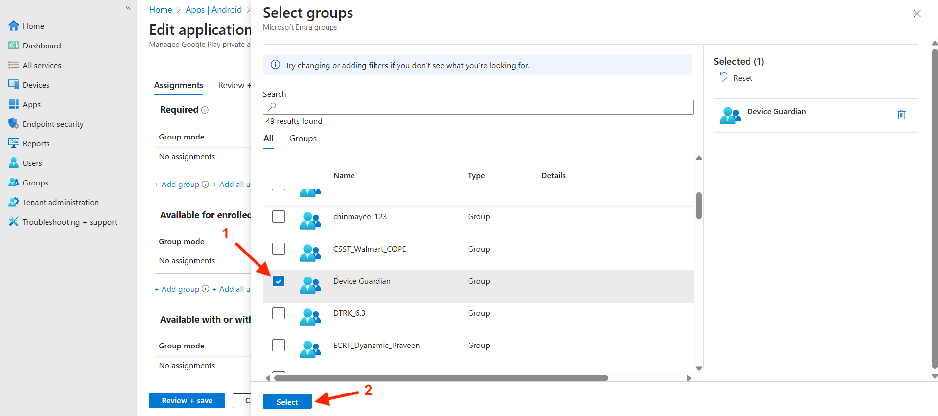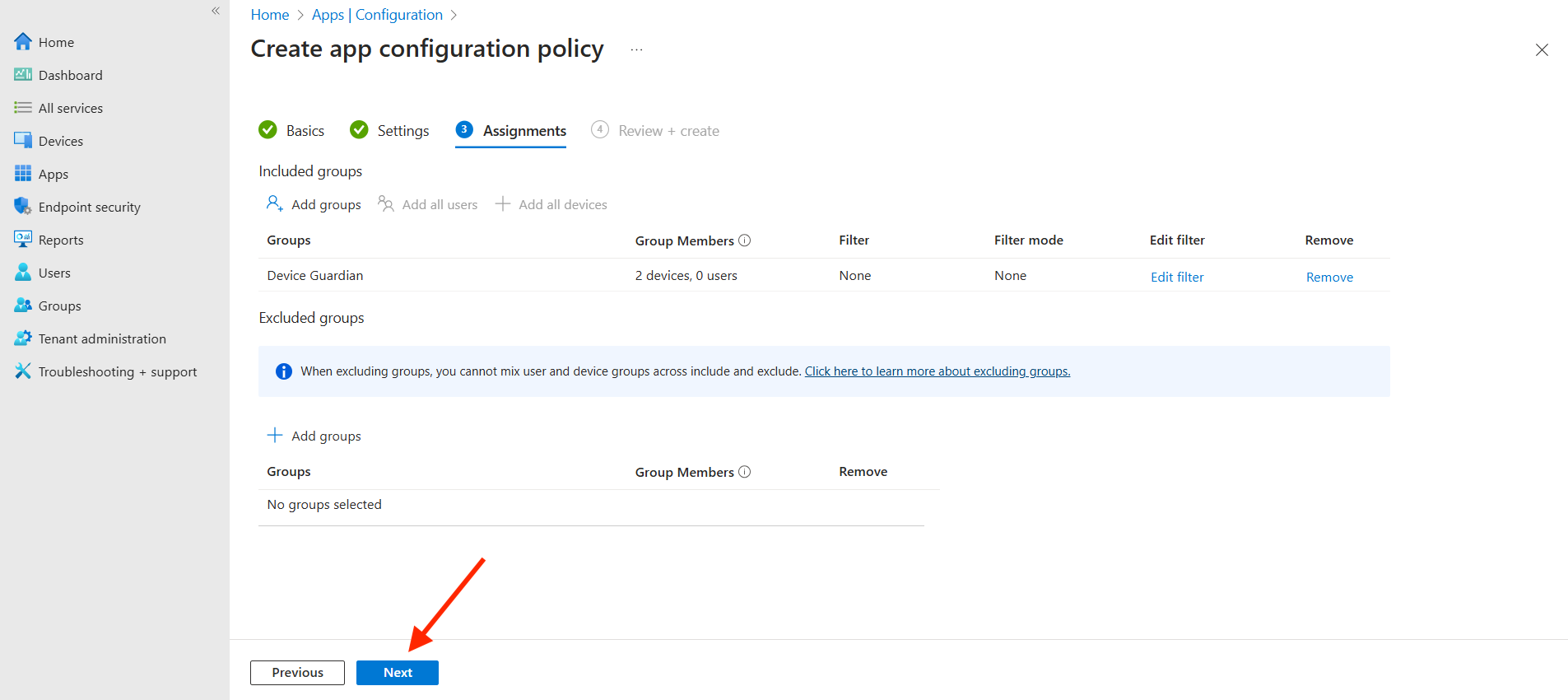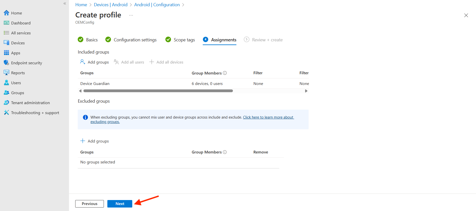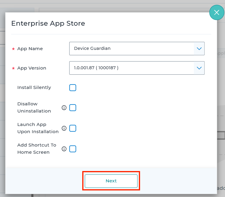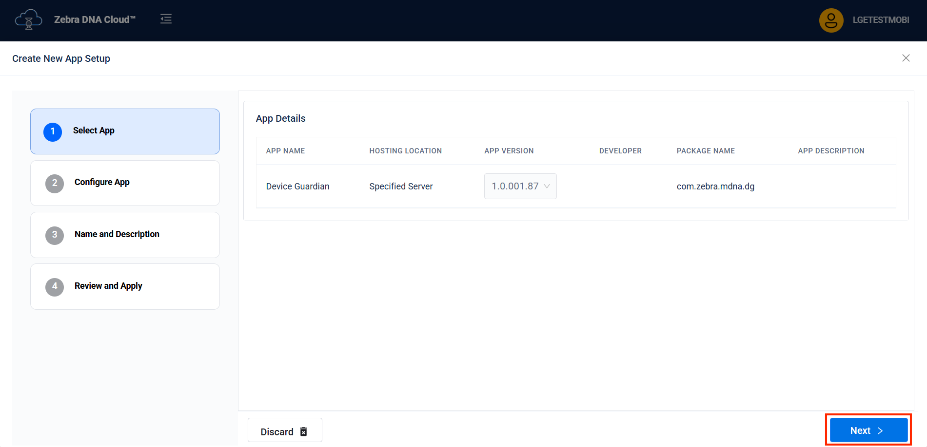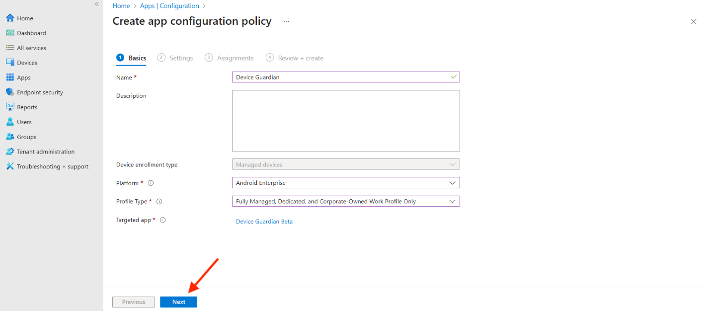 - From the dropdown, select the Device Guardian app uploaded. Click Next.