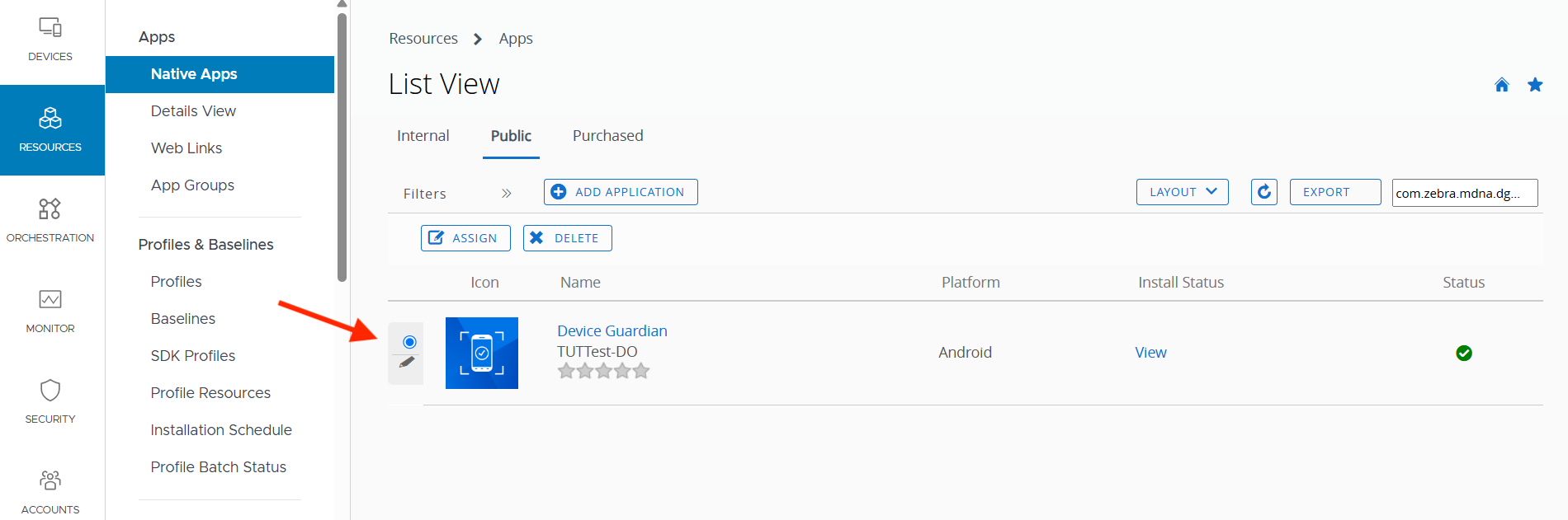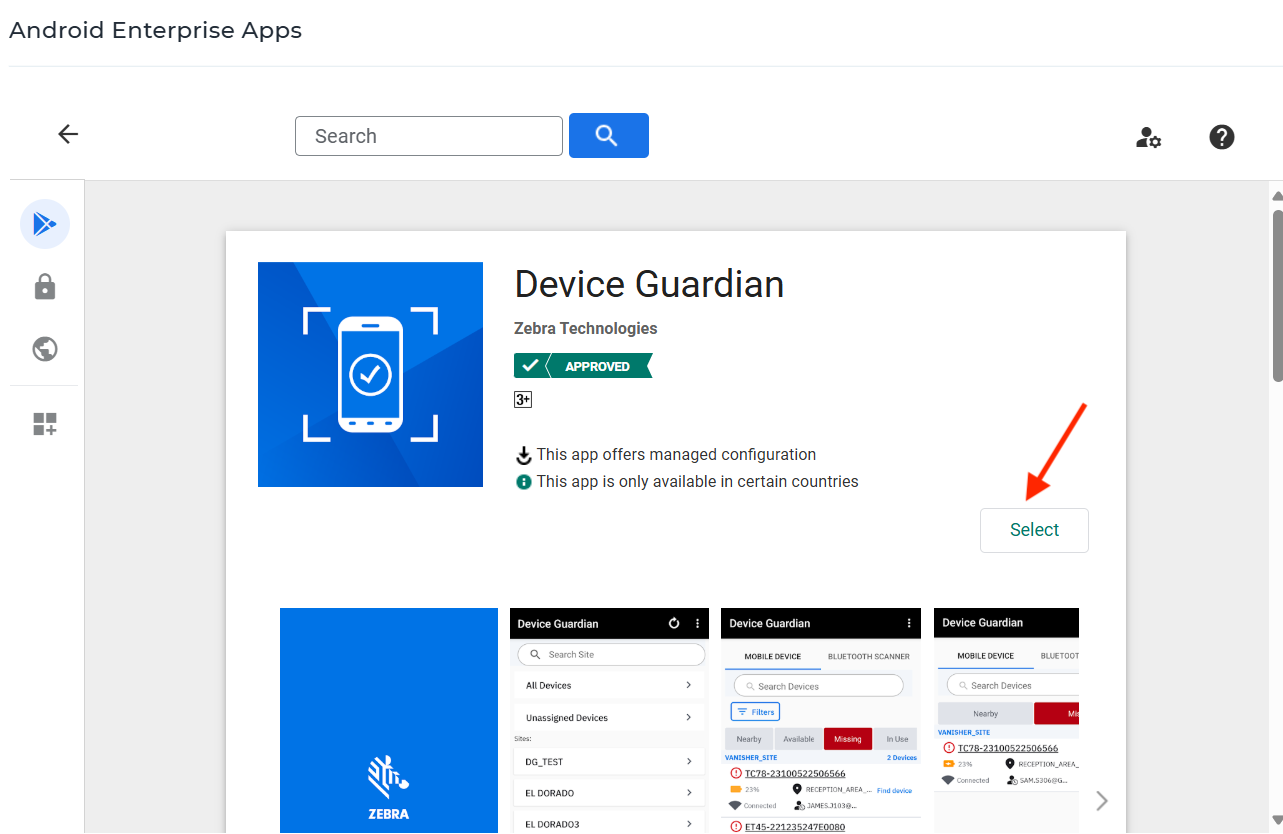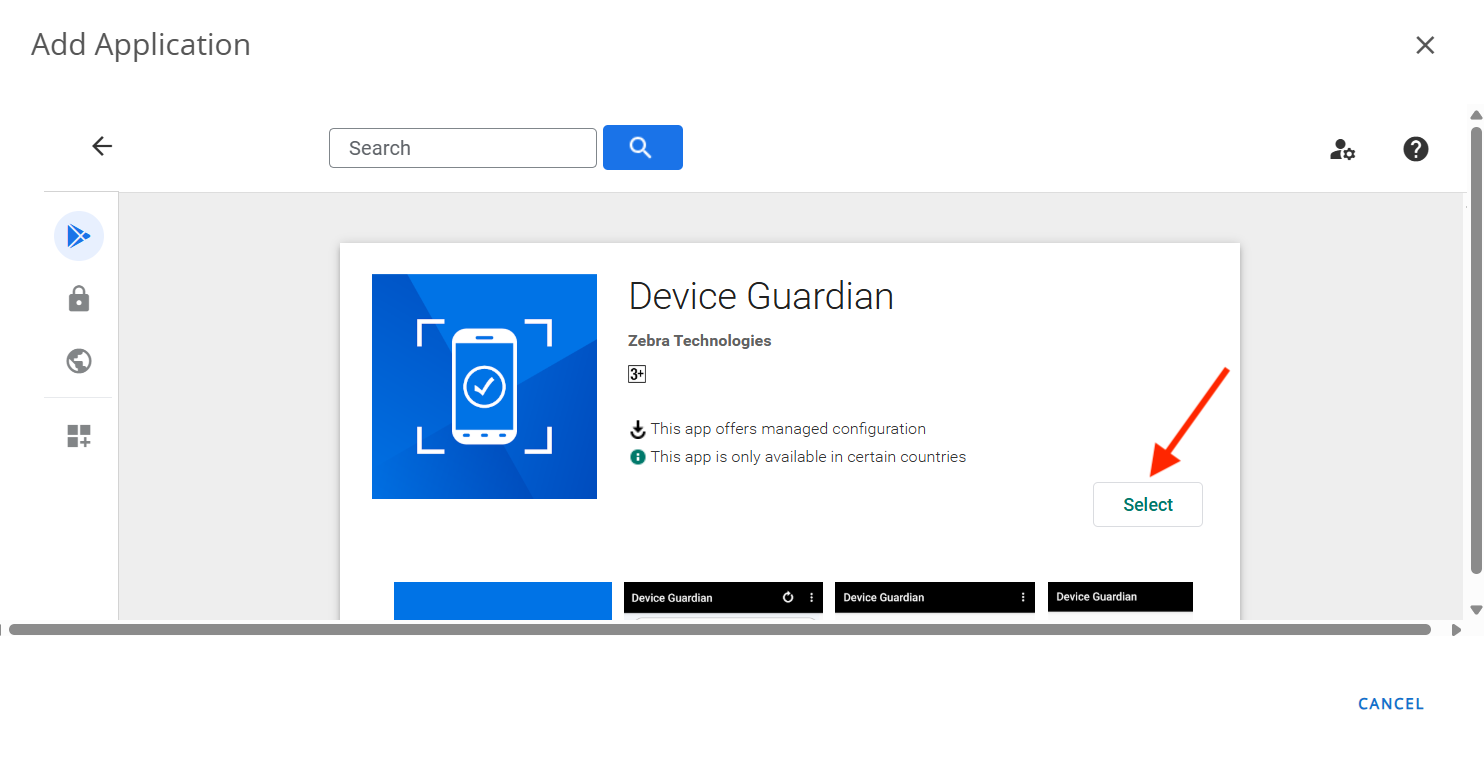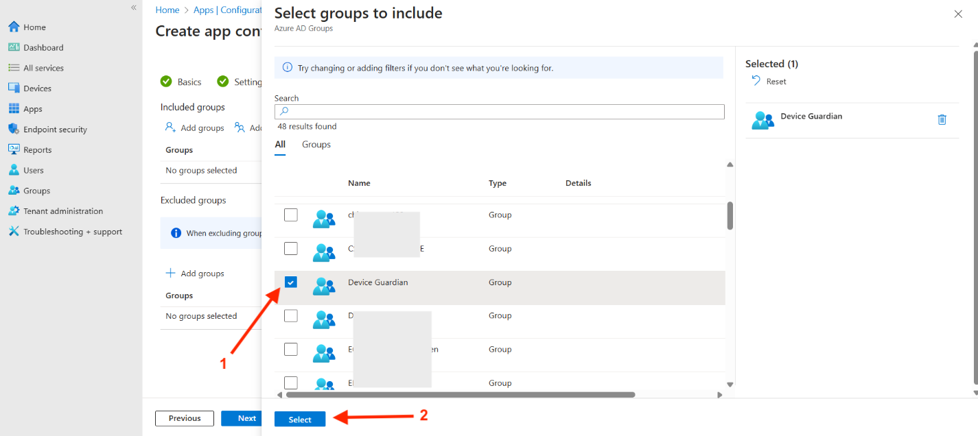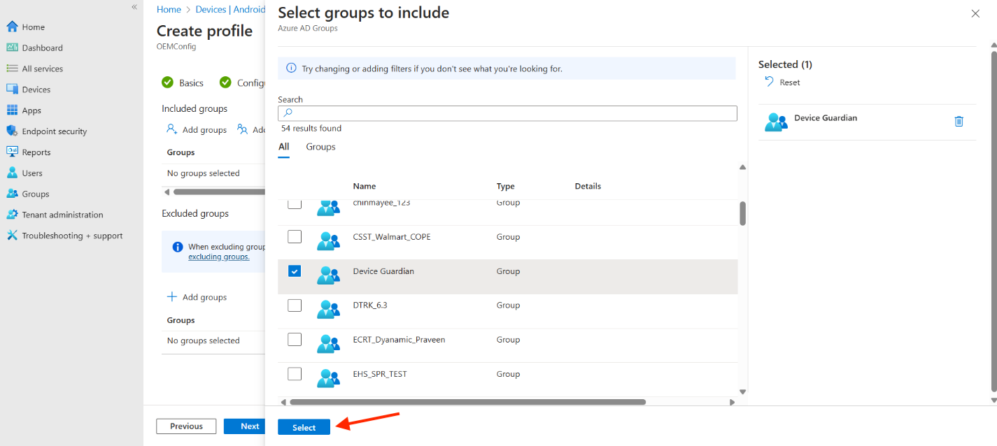 - From the dropdown, select the Device Guardian app uploaded. Click Next.