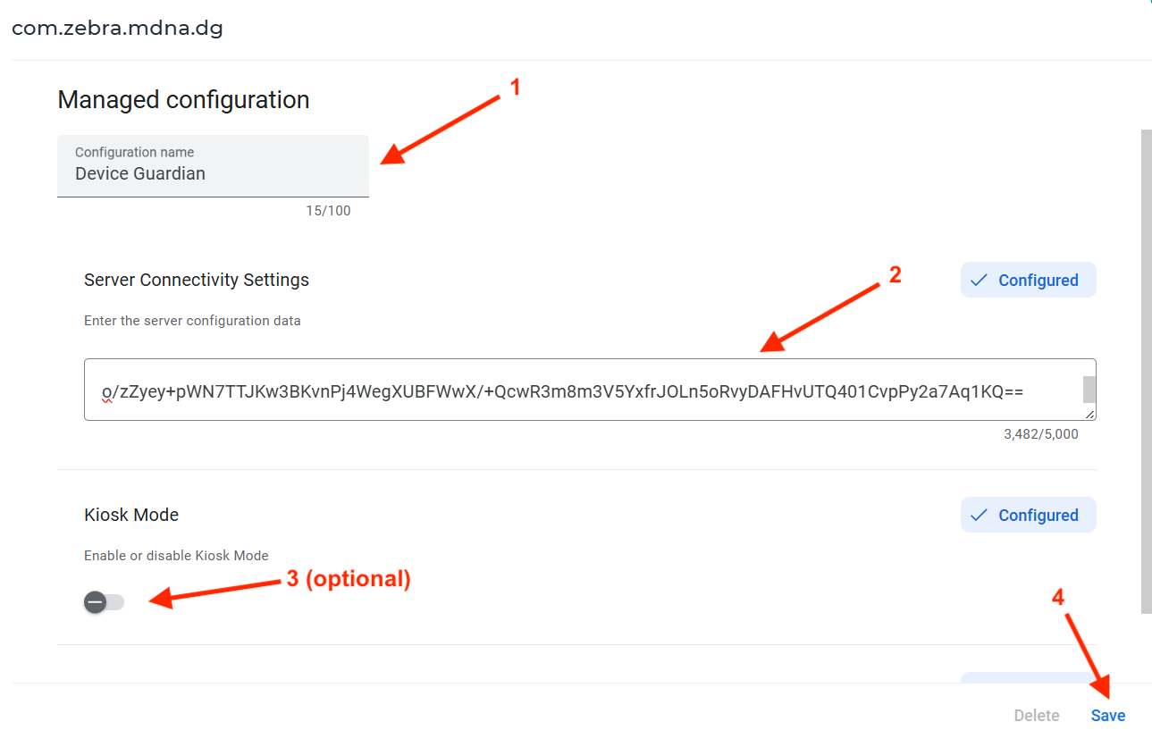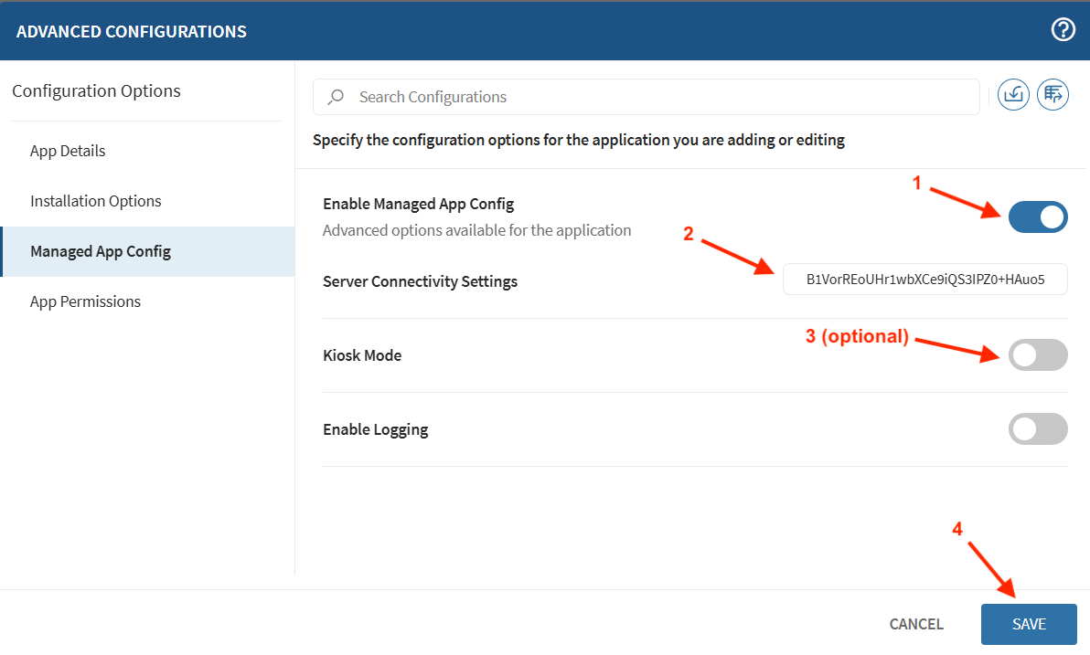 - Server Connectivity Settings: [Copy and paste the content from the Managed Configurations .CONFIG file from step II.2.]