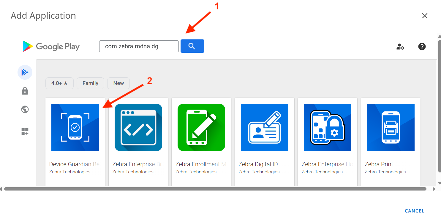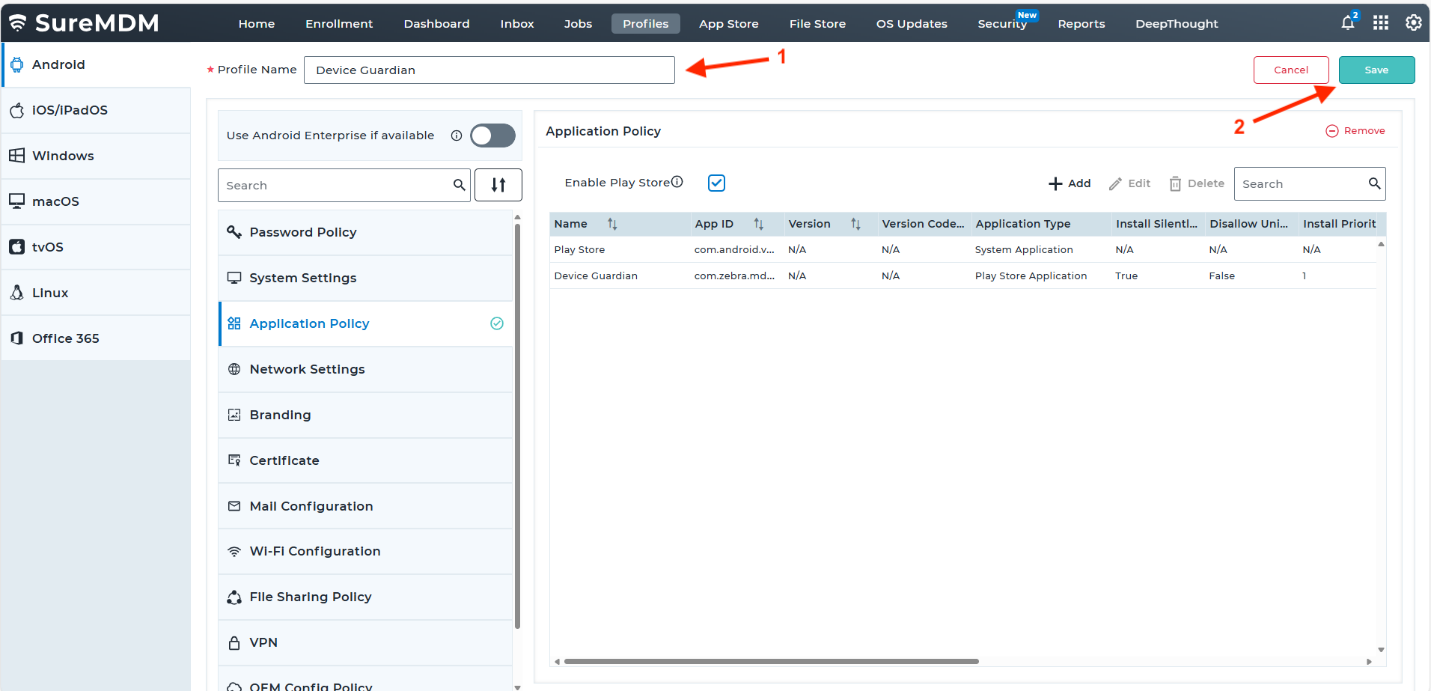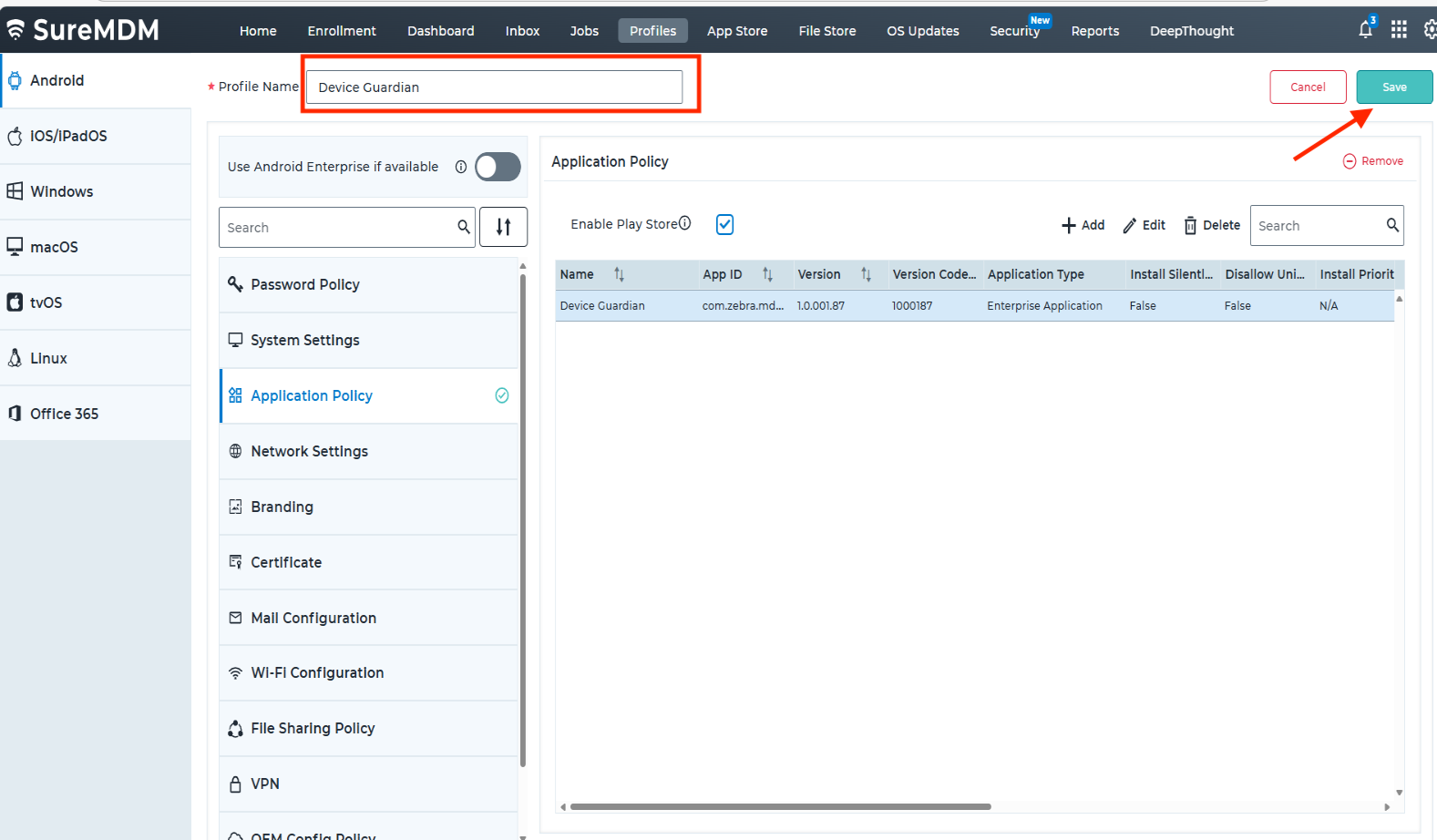 Follow these steps to use 42Gears SureMDM to install Device Guardian from the Google Play Store and apply a policy that enrolls the device with the Device Guardian server.