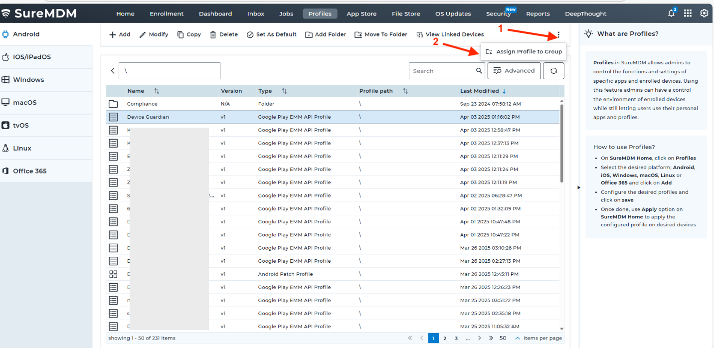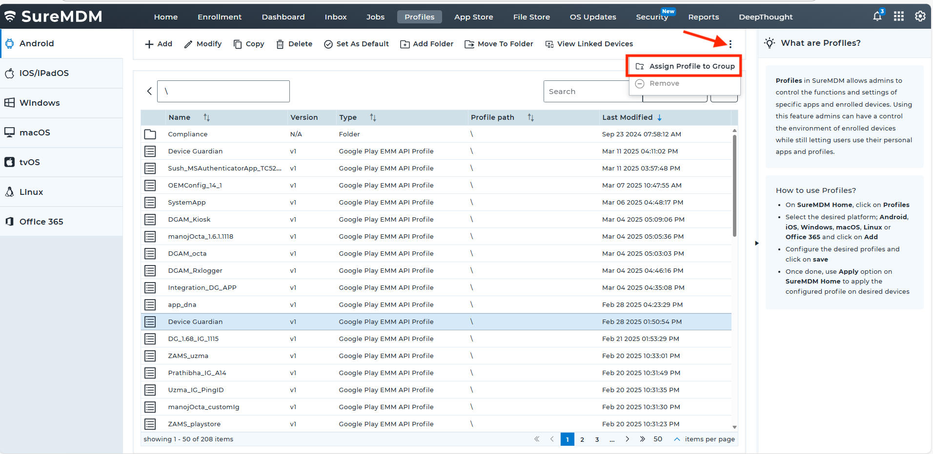 - From the top-right hamburger menu, select Assign Profile to Group.