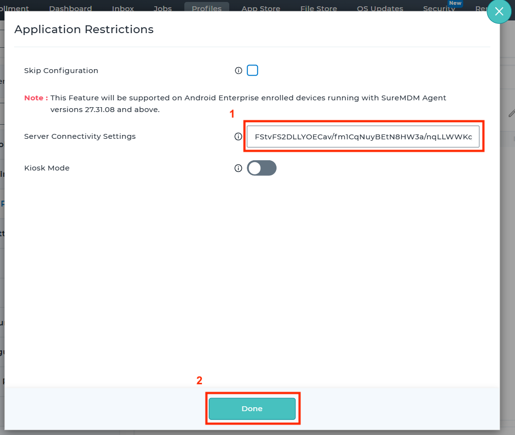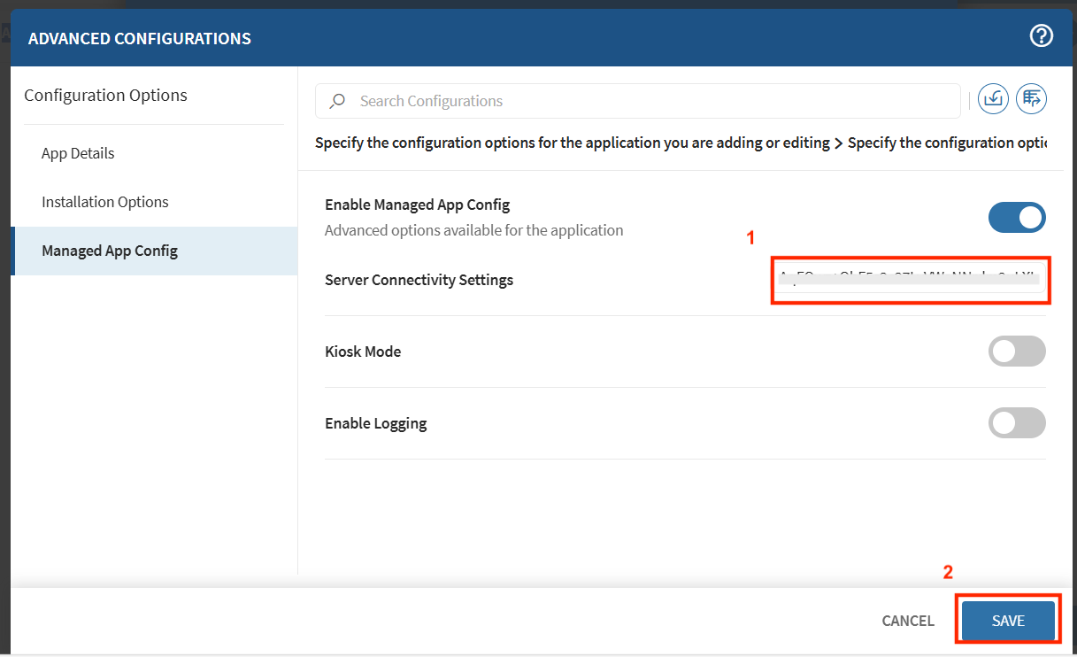 - For Server Connectivity Settings, copy and paste the content from the Managed Configurations .CONFIG file from step II.2. If the device is a kiosk, enable Kiosk Mode. Click Done.