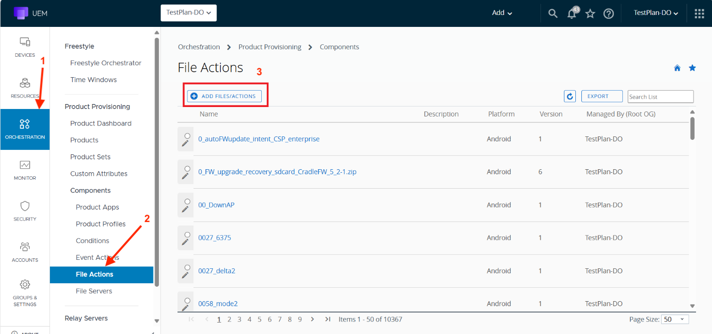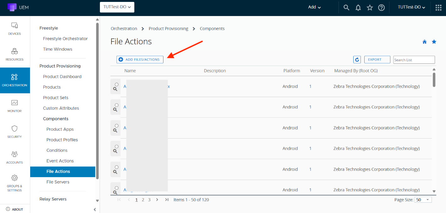 In the Workspace ONE UEM web console, go to Orchestration > File Actions. Click Add Files/Actions.