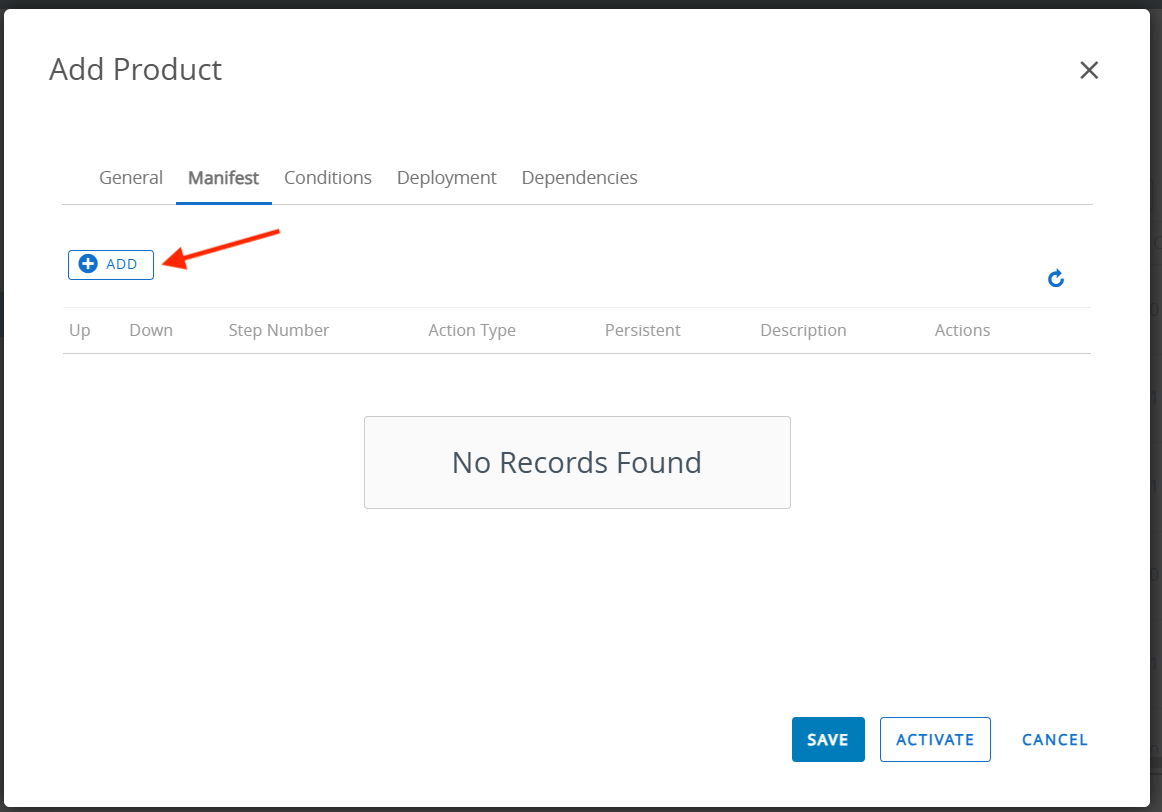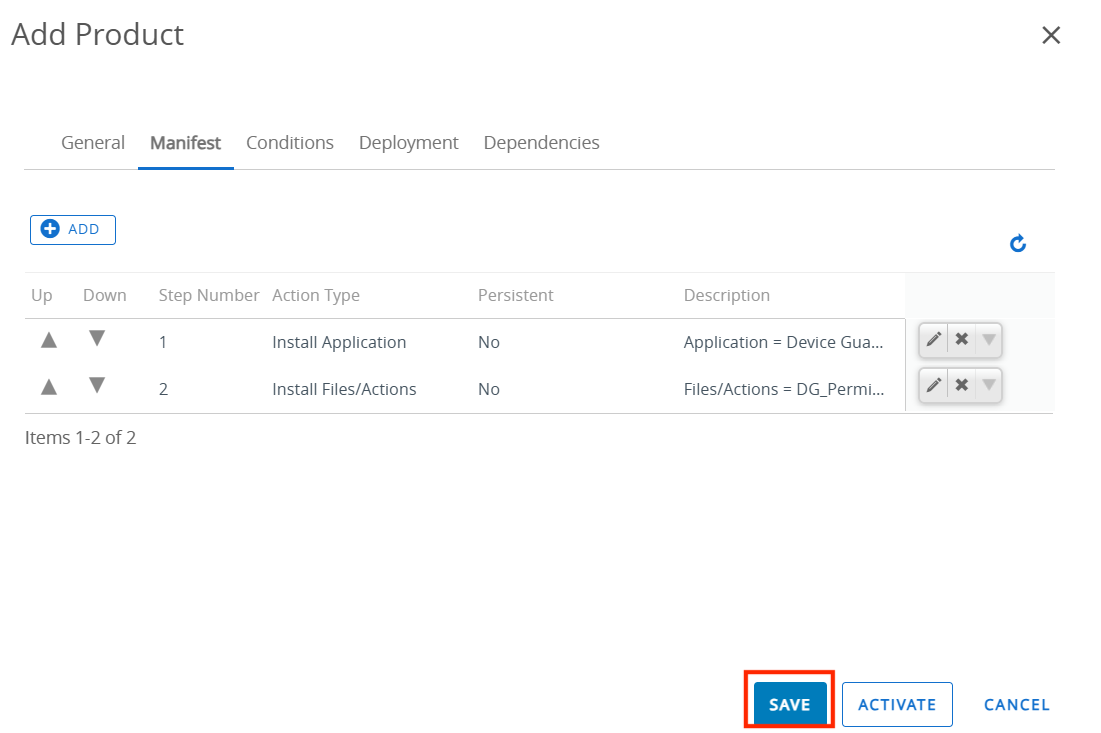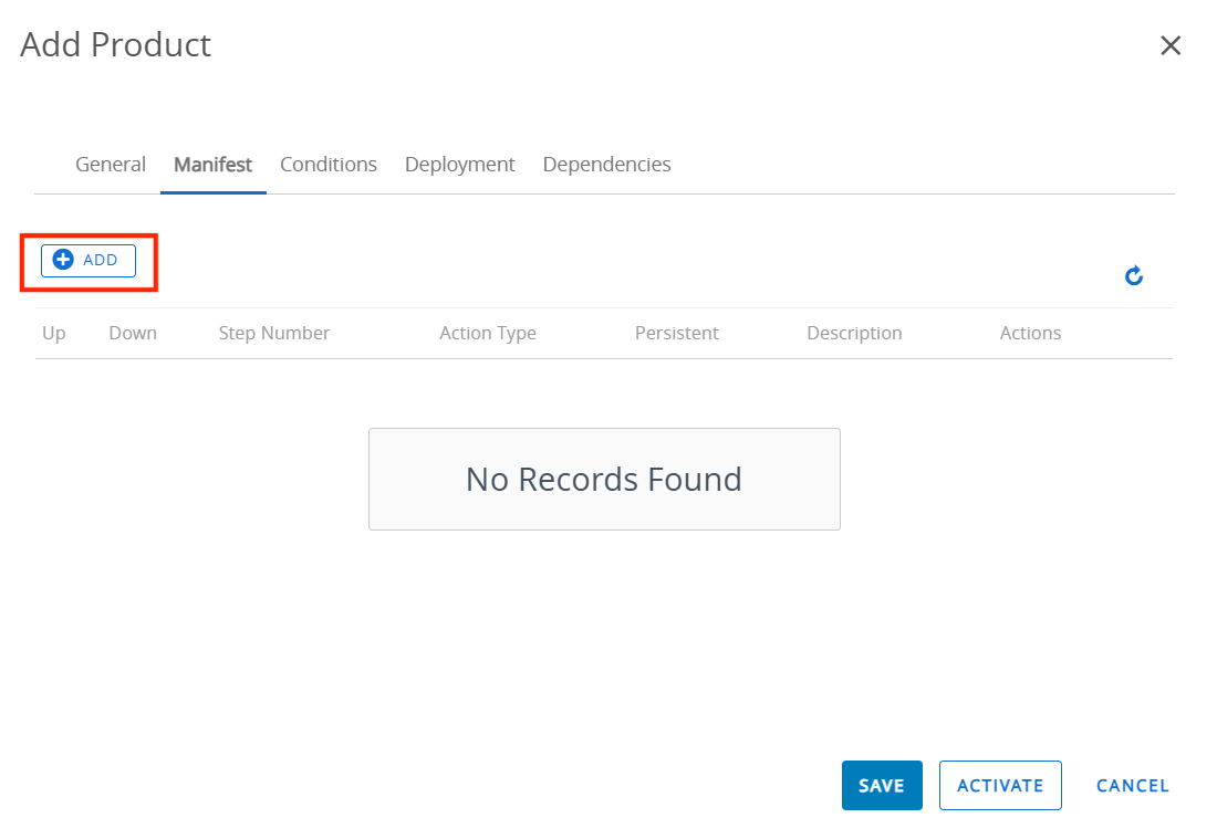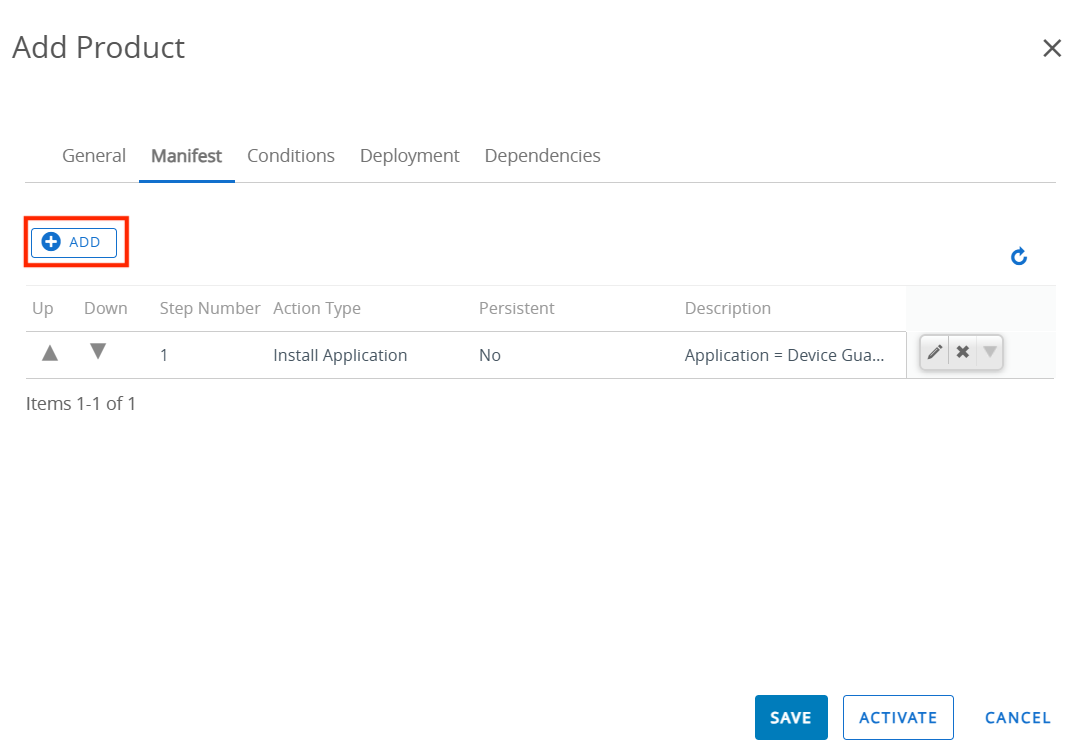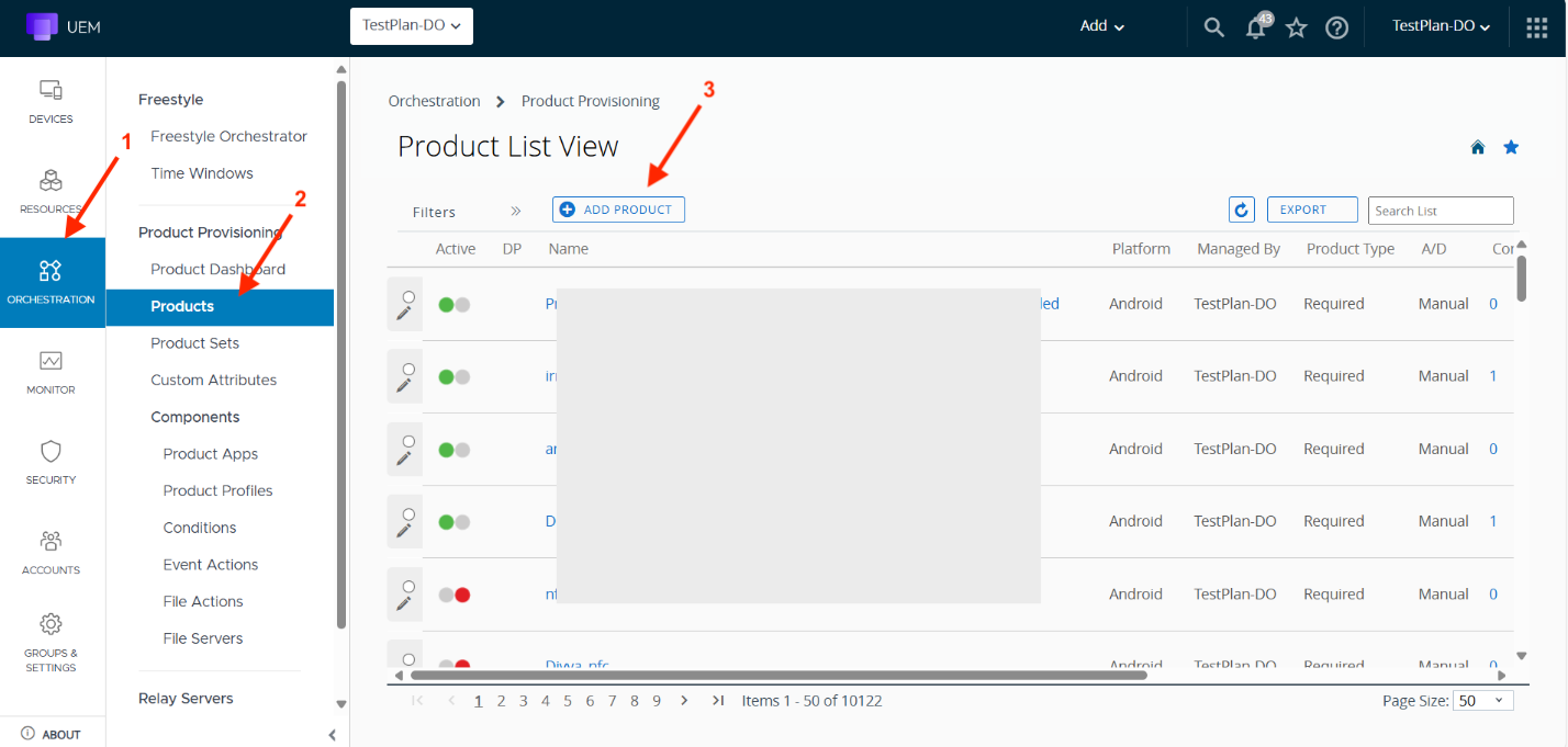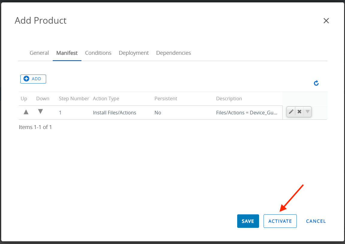 - The File/Action is created. Next, apply it to the device(s). Go to Orchestration > Product. Click Add Product.