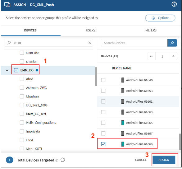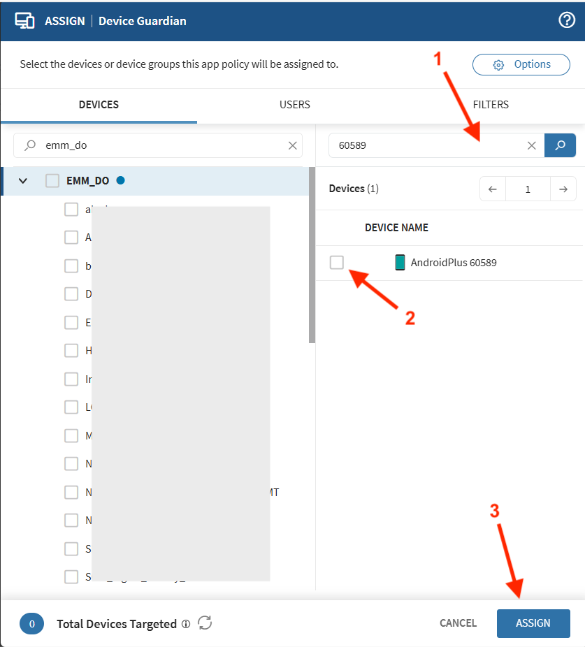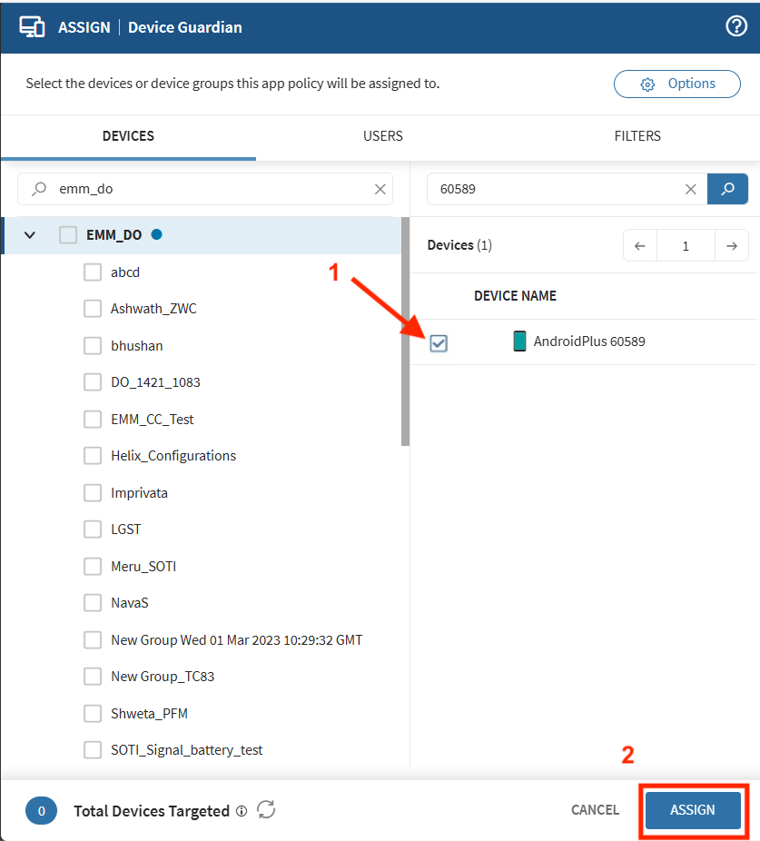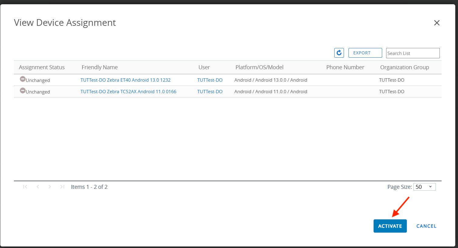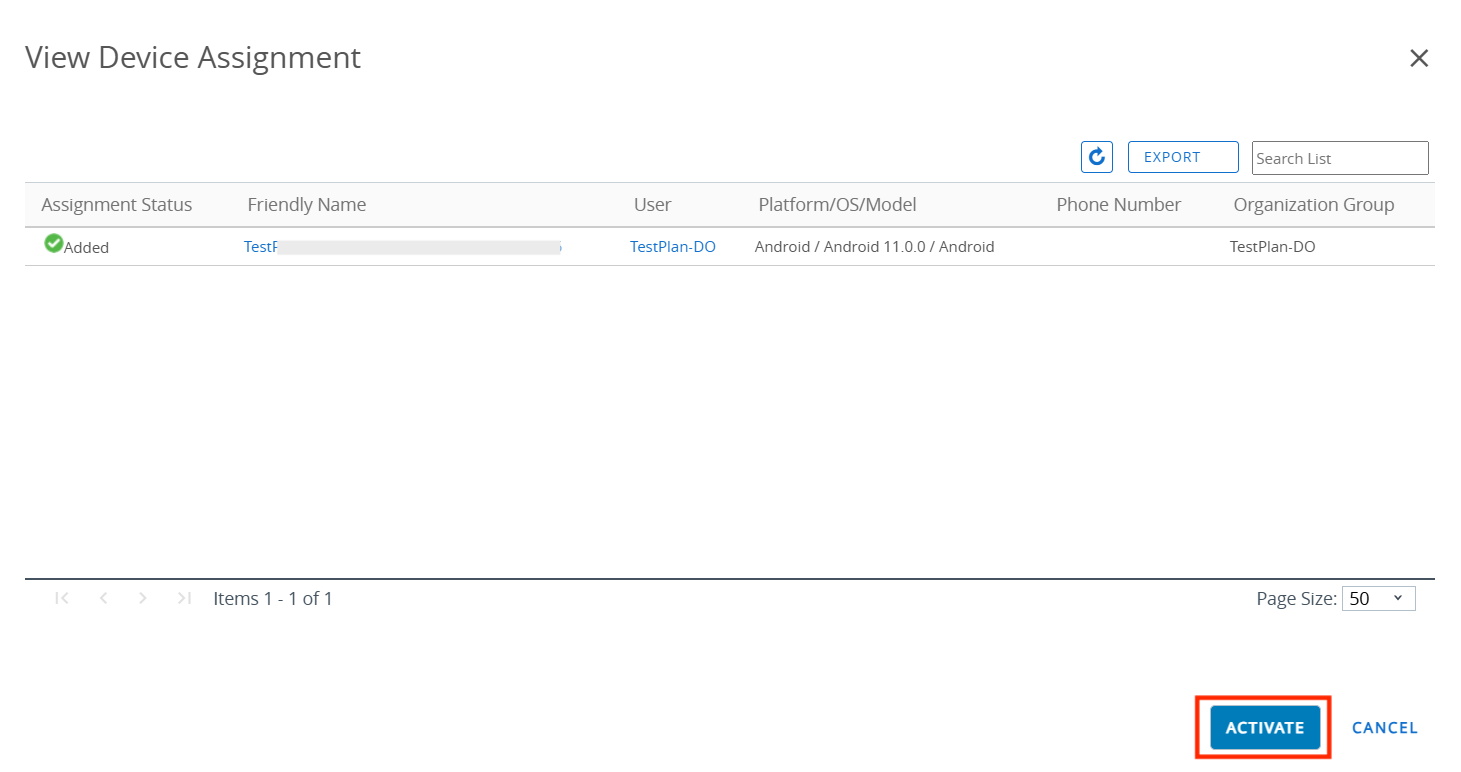 The assigned devices are listed. Click Activate. This sends the intent, launching Device Guardian on the devices for the configurations to be applied.