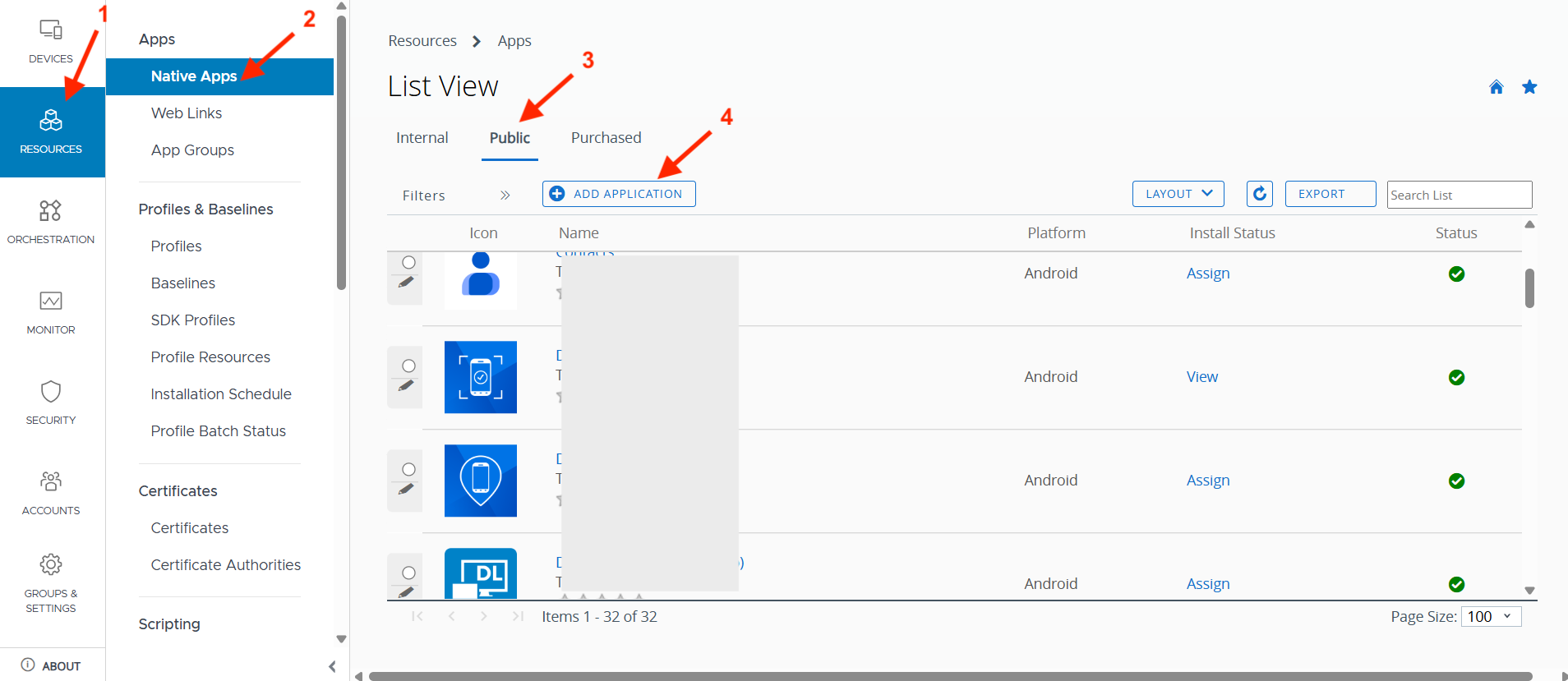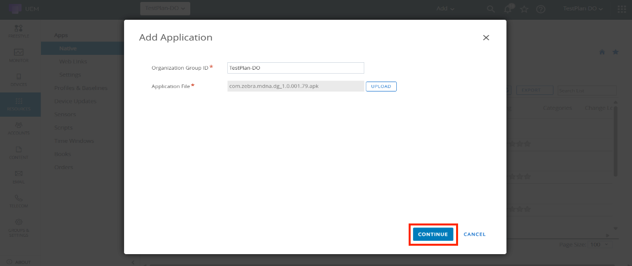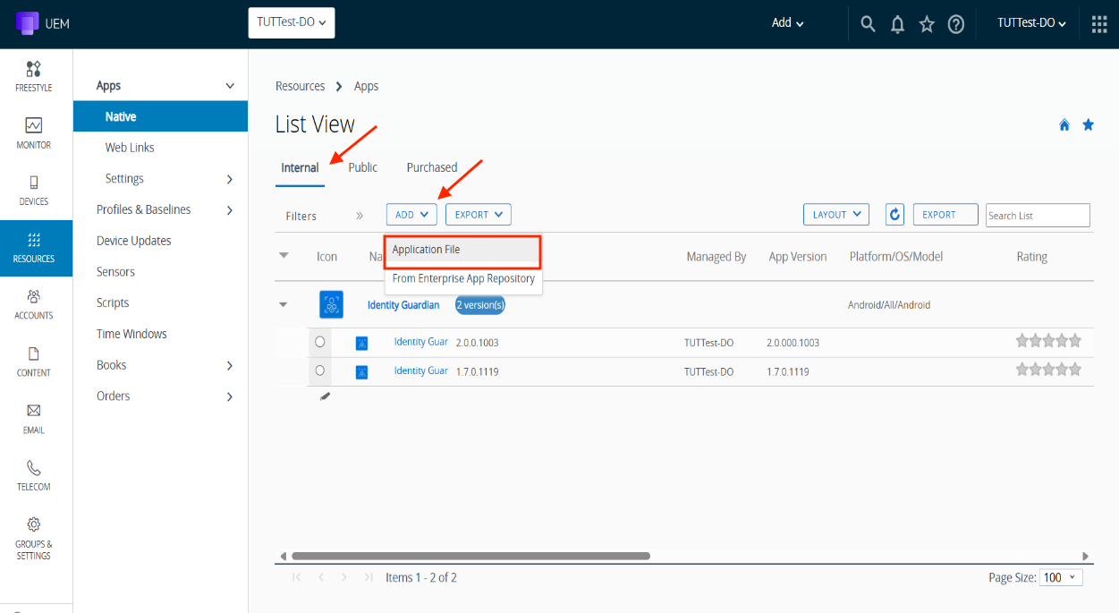 - In the Workspace ONE UEM web console, go to Resources > Native. Click Internal, then Add, and select Application File.
