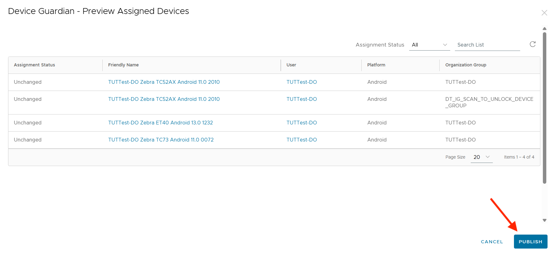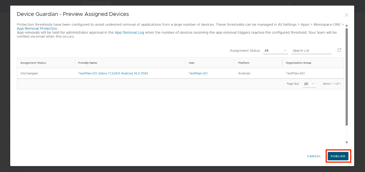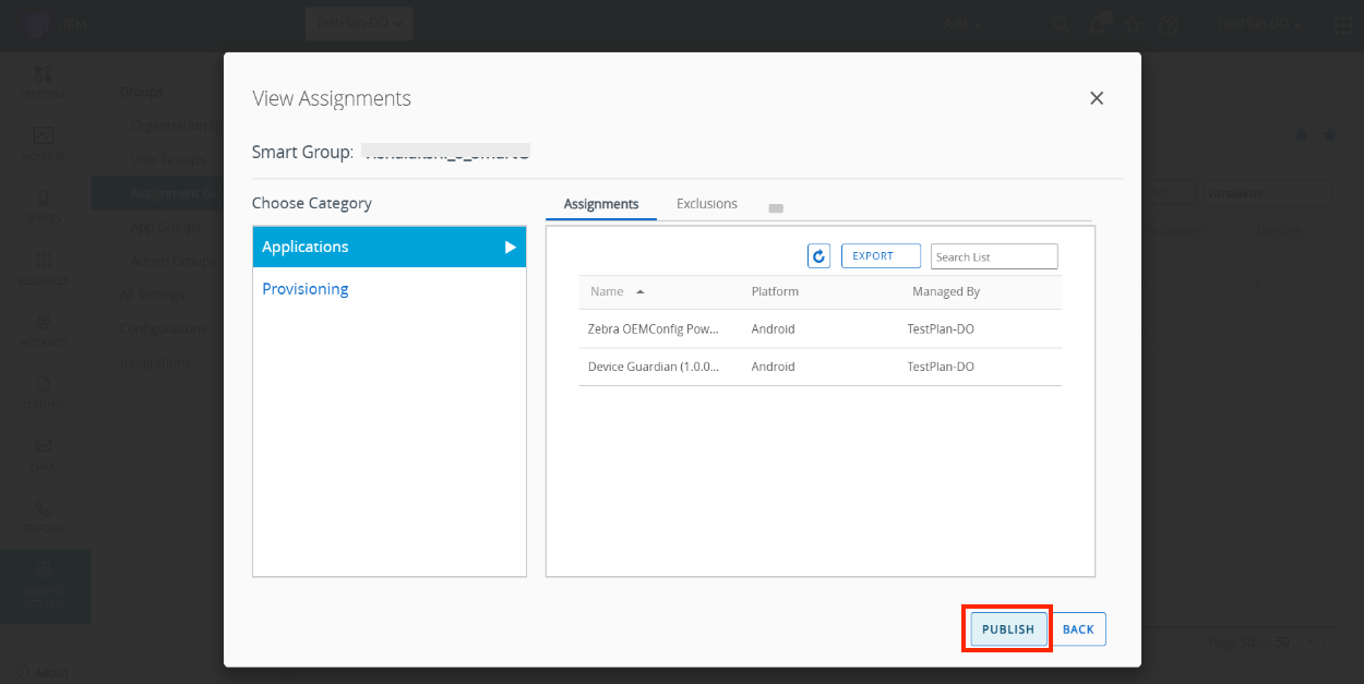 - Verify the assigned applications and click Publish. The policy is applied to the device.