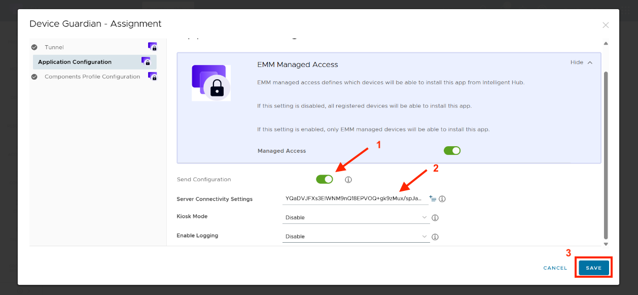 - Enable Send Configuration. For Server Connectivity Settings, copy and paste the content from the Managed Configurations .CONFIG file from step II.2. Select the target device(s). Click Save.