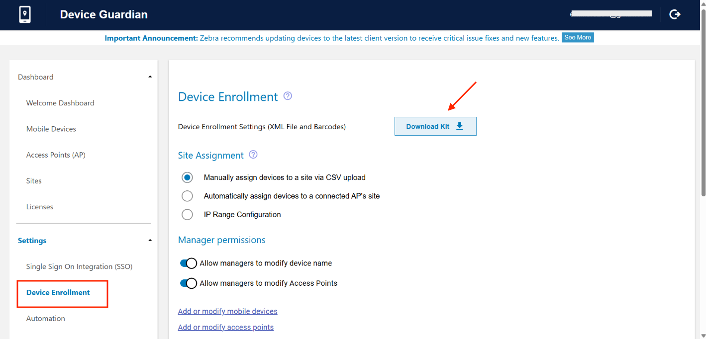 - In the left menu of the Device Guardian web portal, go to Settings > Device Enrollment. Click on Download Kit.