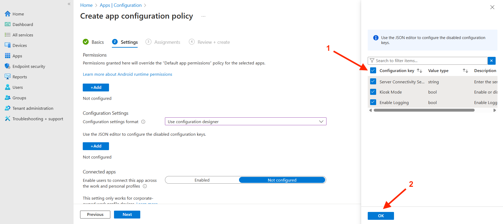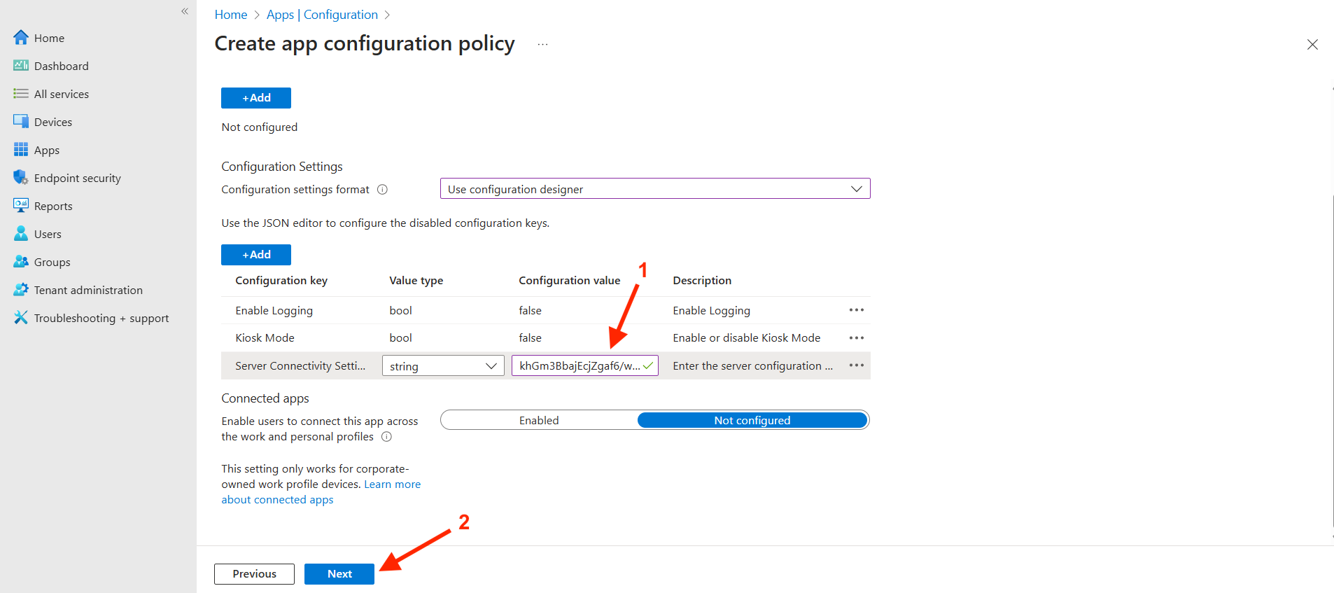- Click Yes to configure the app. Enable Server Connectivity Settings and copy and paste the content from the Managed Configurations .CONFIG file from step II.2, then click Next.