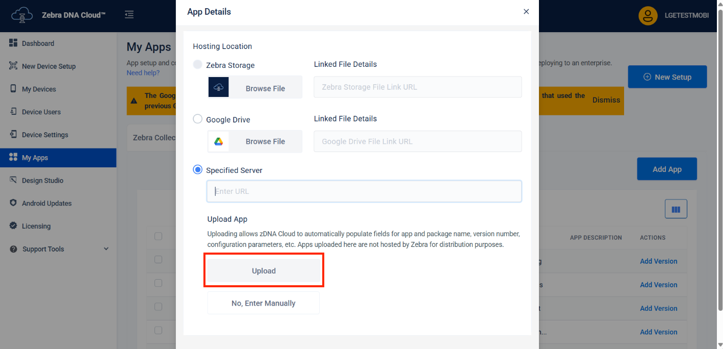 - Select the appropriate hosting location, provide the details, and click Upload.