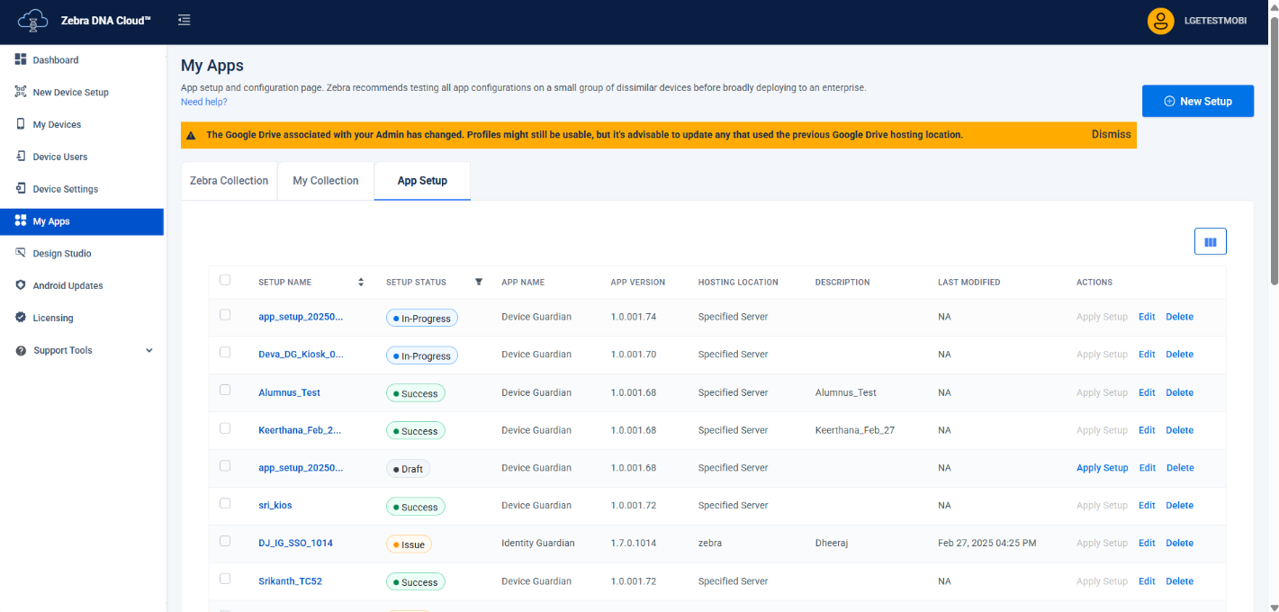 - The device(s) is listed under the App Setup tab with the status of applying the configuration. Once complete, "Success" is displayed as the status.
