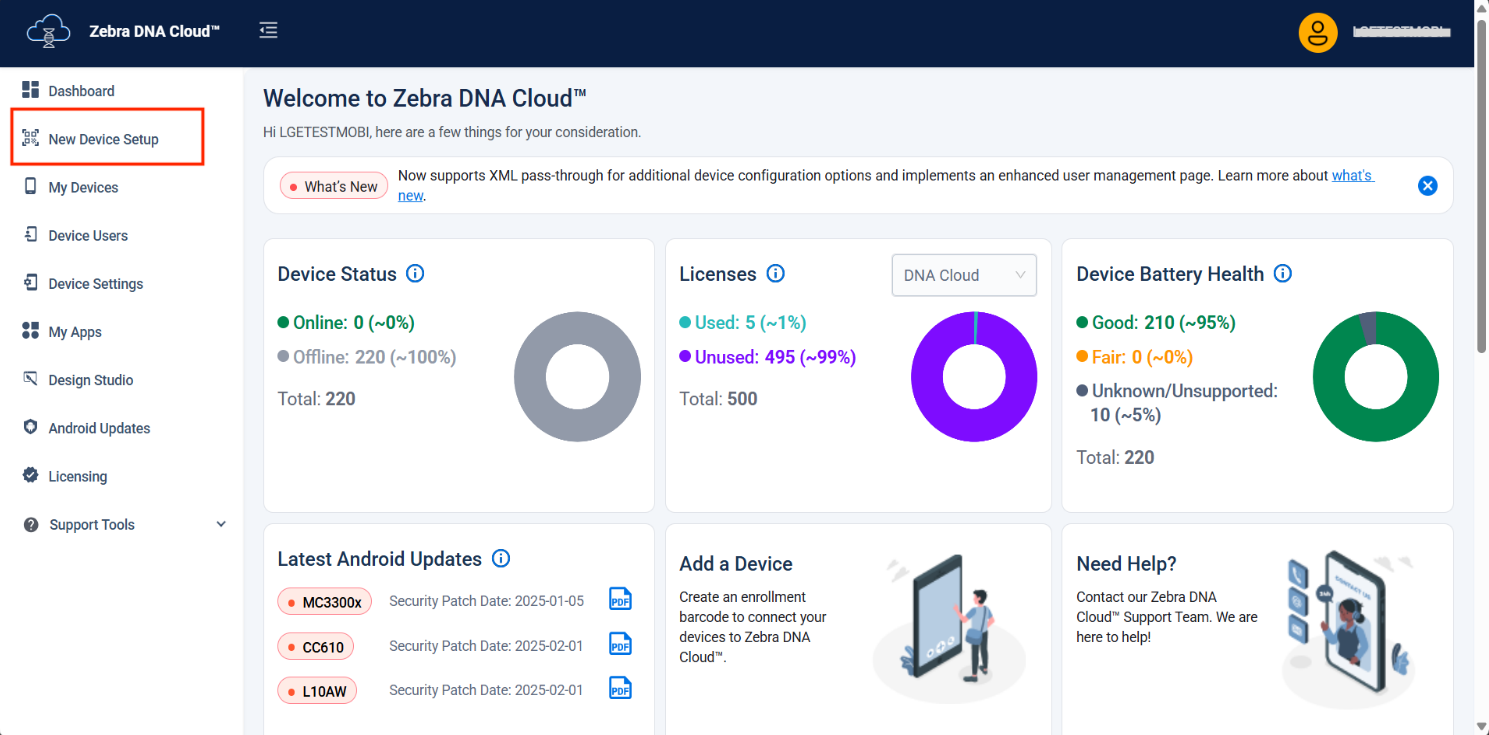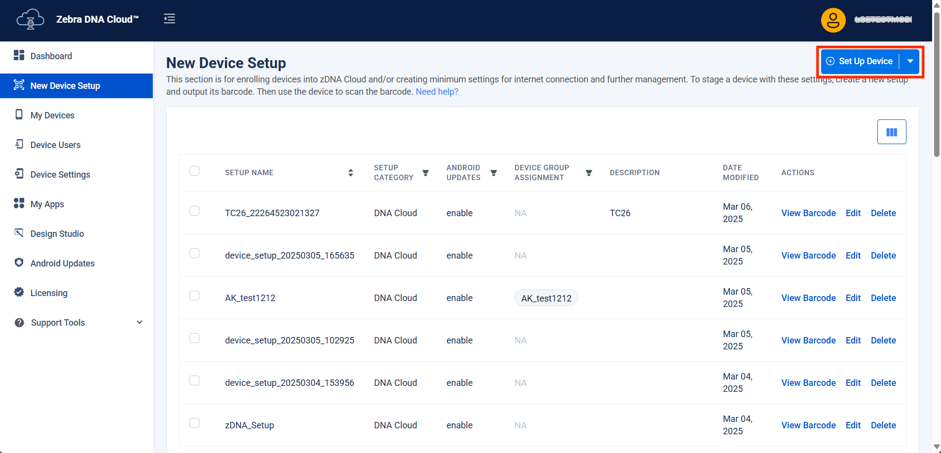 - Log in to ZDNA web portal. In the left menu, click New Device Setup.