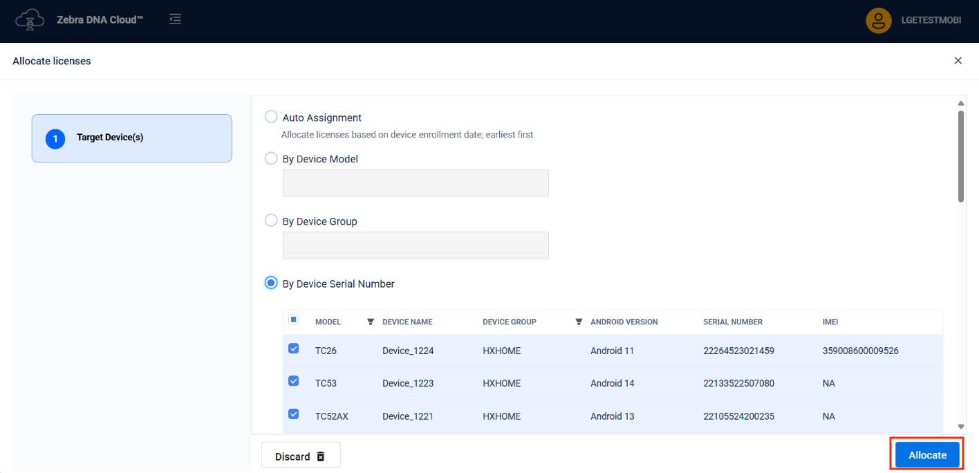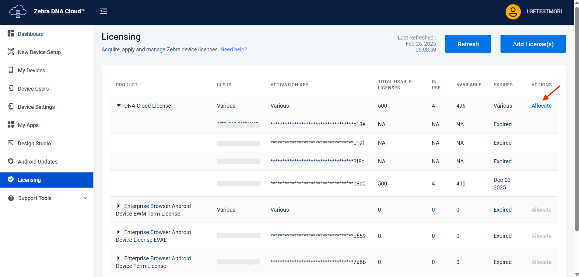 - Allocate the license for the enrolled device. Click Licensing from the left menu. Under DNA CLoud License, click Allocate.