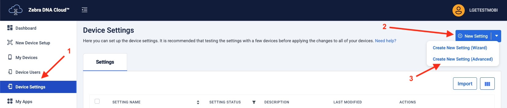 - In the ZDNA Cloud web portal, go to Device Settings. Click New Setting, then Create New Setting (Advanced).