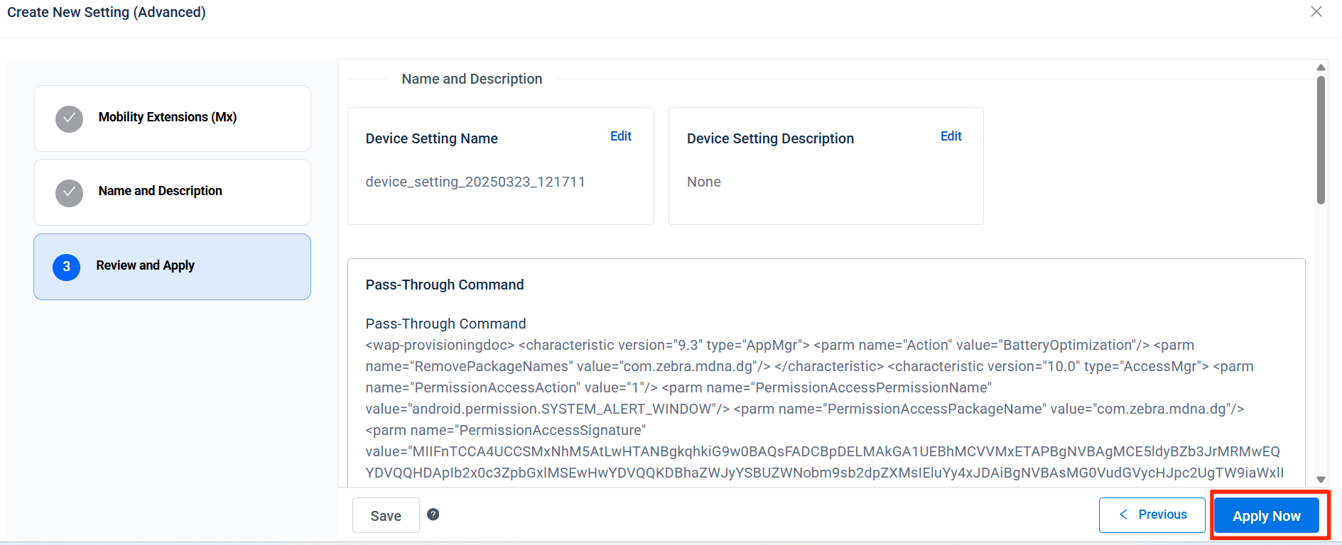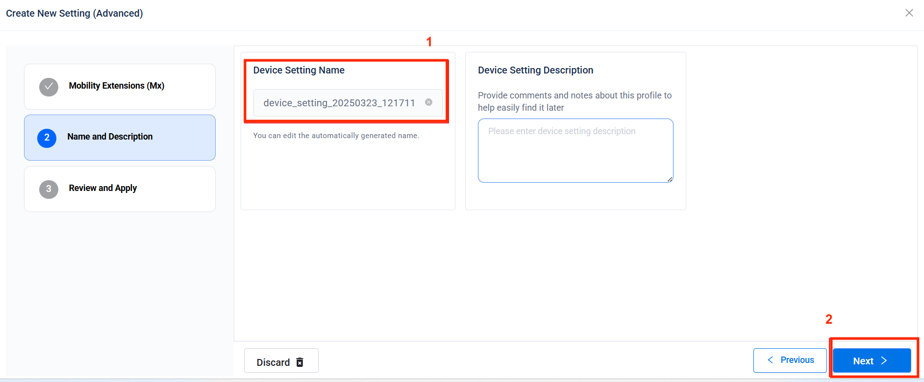 - Enter a Device Settings Name and Description, if needed, then click Next.
