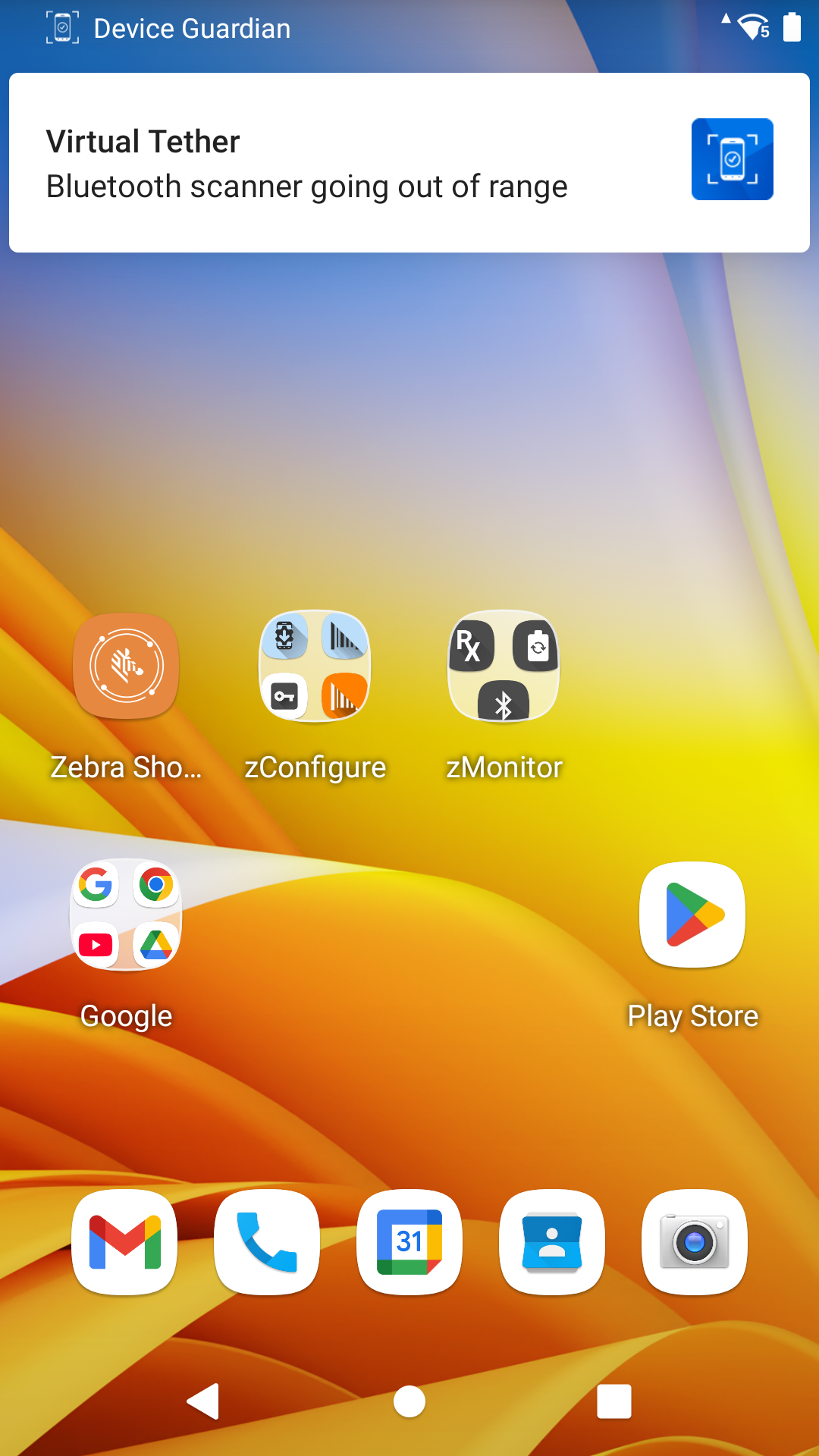 Virtual Tethering notifies the user if a paired Bluetooth scanner is moving beyond the effective Bluetooth range from its associated mobile computer. A pop-up notification appears on the mobile computer indicating that the Bluetooth scanner is moving out of range. Supplemental notifications in the form of beeping, LED flashing, audio tone, and vibration can occur on the Bluetooth scanner and mobile computer. These alert options vary depending on the device. Virtual Tethering and its options are enabled in the Bluetooth Scanners setting from the web portal.