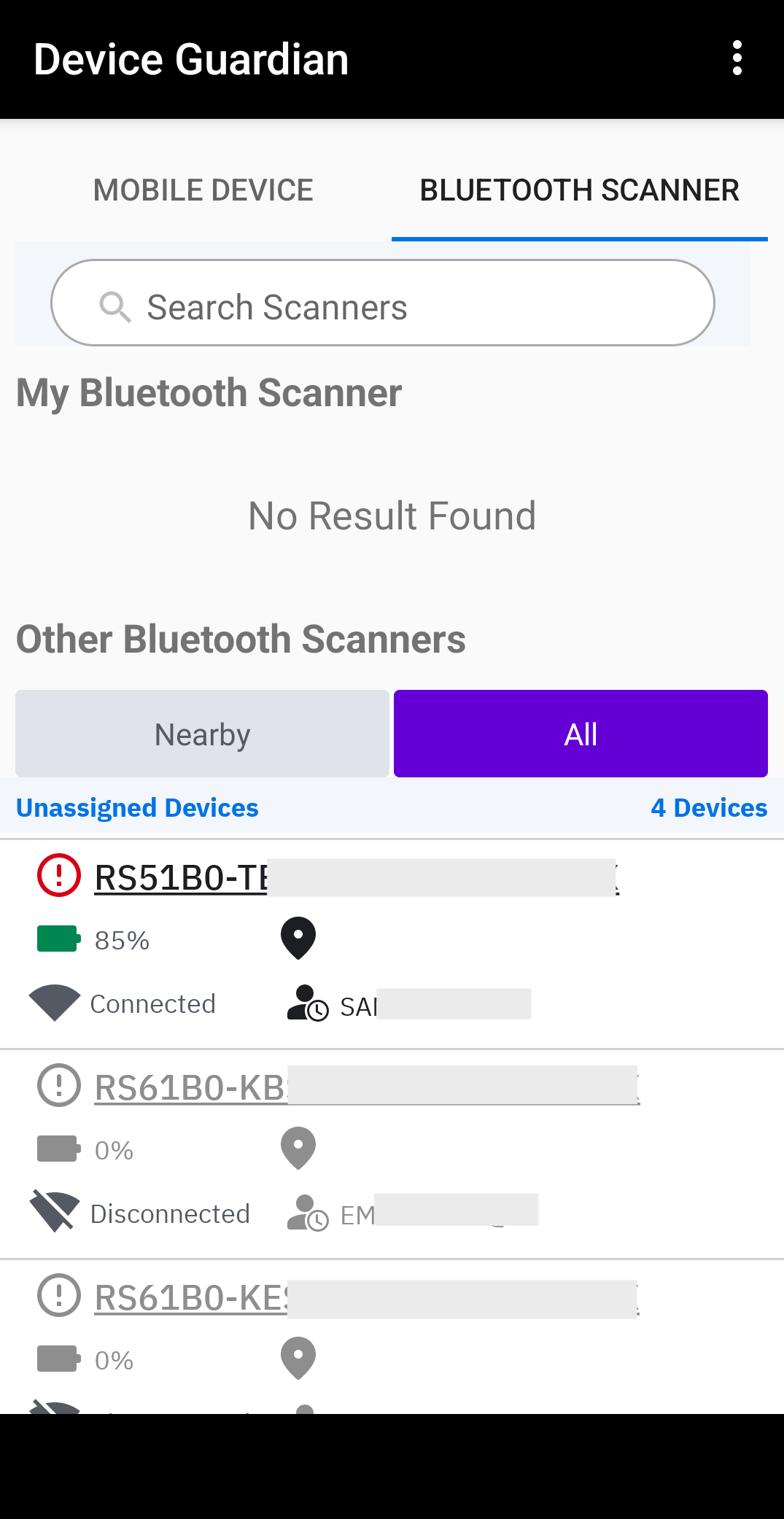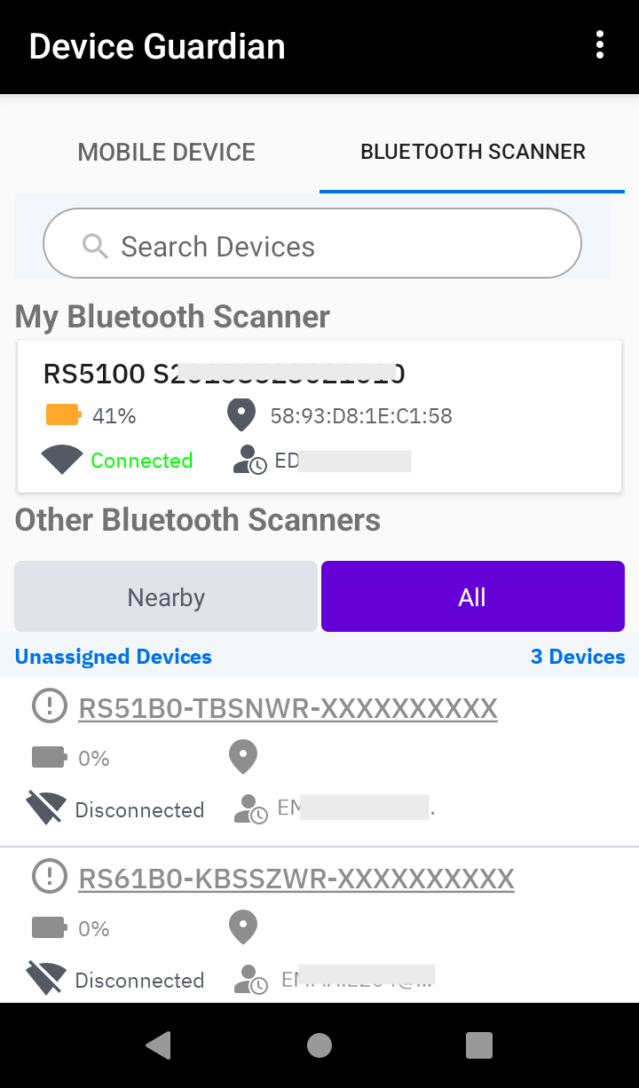 1. On the device, open Device Guardian client. Tap on the device tile under My Bluetooth Scanner. image