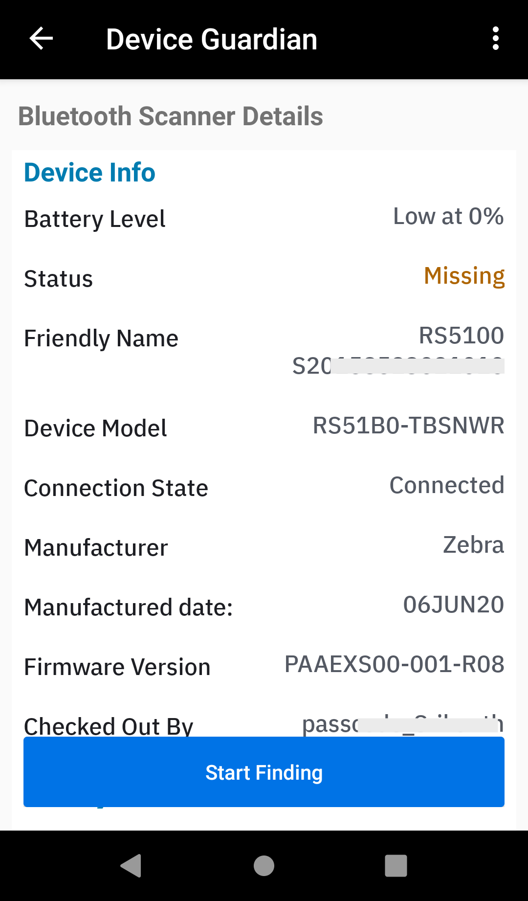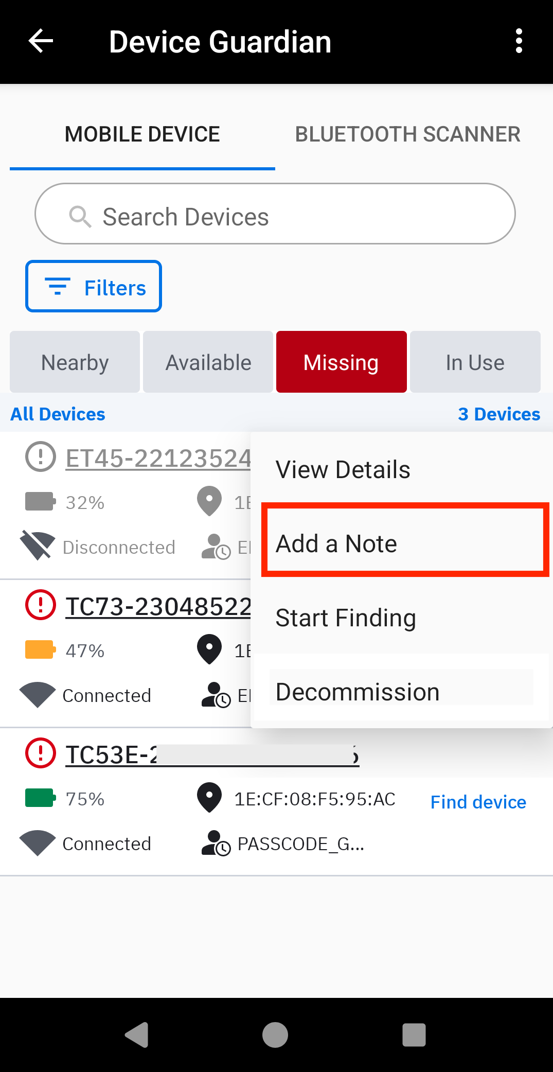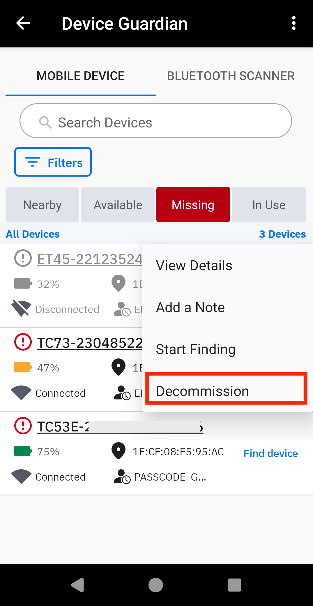 This procedure automatically registers the Bluetooth scanner to the Device Guardian system. If lost, it can be marked as Missing (To Be Found) to initiate the search.
