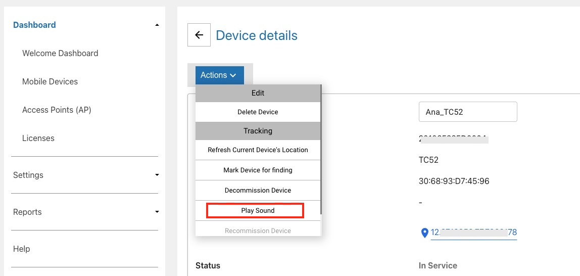 4. The Device Details screen appears. From the Actions dropdown, select Play Sound. image