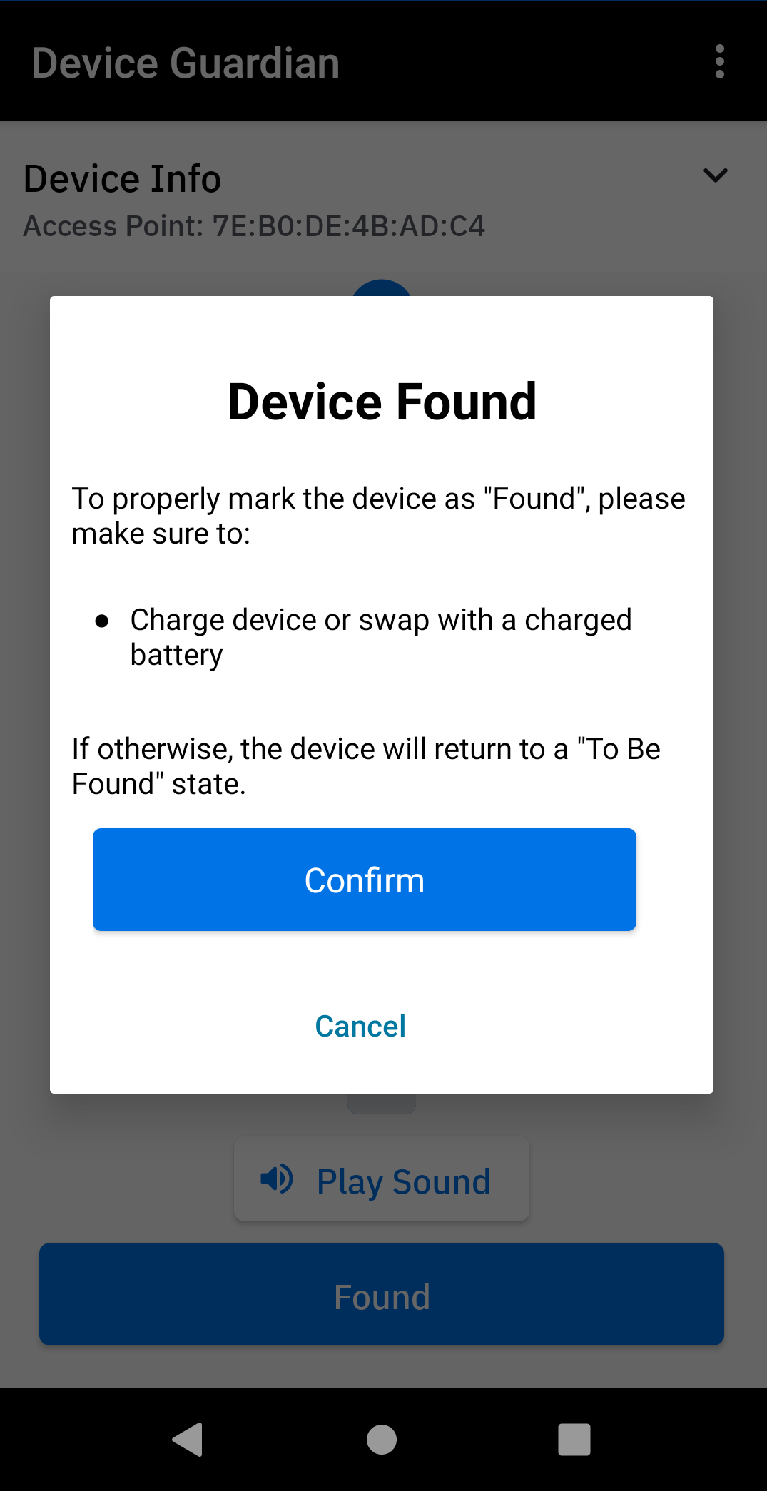 • If Automation rules are configured with option Automatically Mark Devices "To Be Found" enabled, a message appears prompting the user to take action based on the rule(s) selected and to check each checkbox after action is taken. It is important to execute ALL actions specified, otherwise the device will return back to the Missing (To Be Found) state after it is marked Found based on the automation process. After all action is taken and all checkboxes are checked, tap Confirm. The device state is changed to Found if automation option Automatically place device "In Service" when marked "Found" is disabled. If this option is enabled, the device state is changed to In Service. image