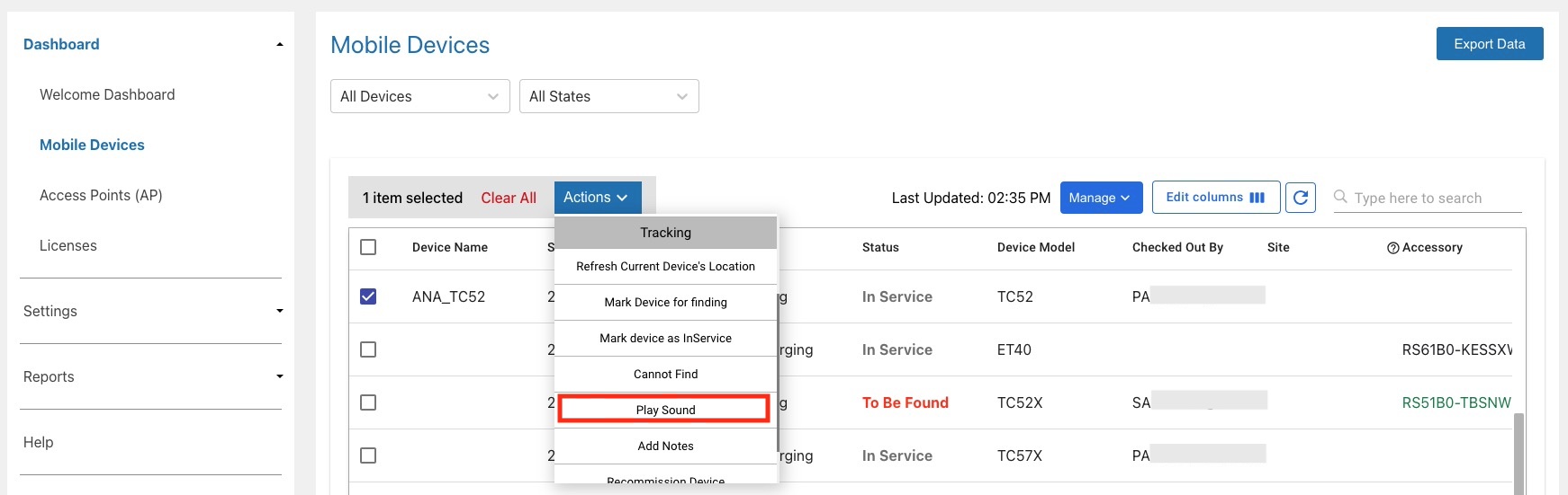 To find a device that is close by, play a sound on the lost or missing device through the Find Device process. Alternatively, managers and administrators can play sound from the web portal through the Actions menu from either the Mobile Devices dashboard or Device Details screen.