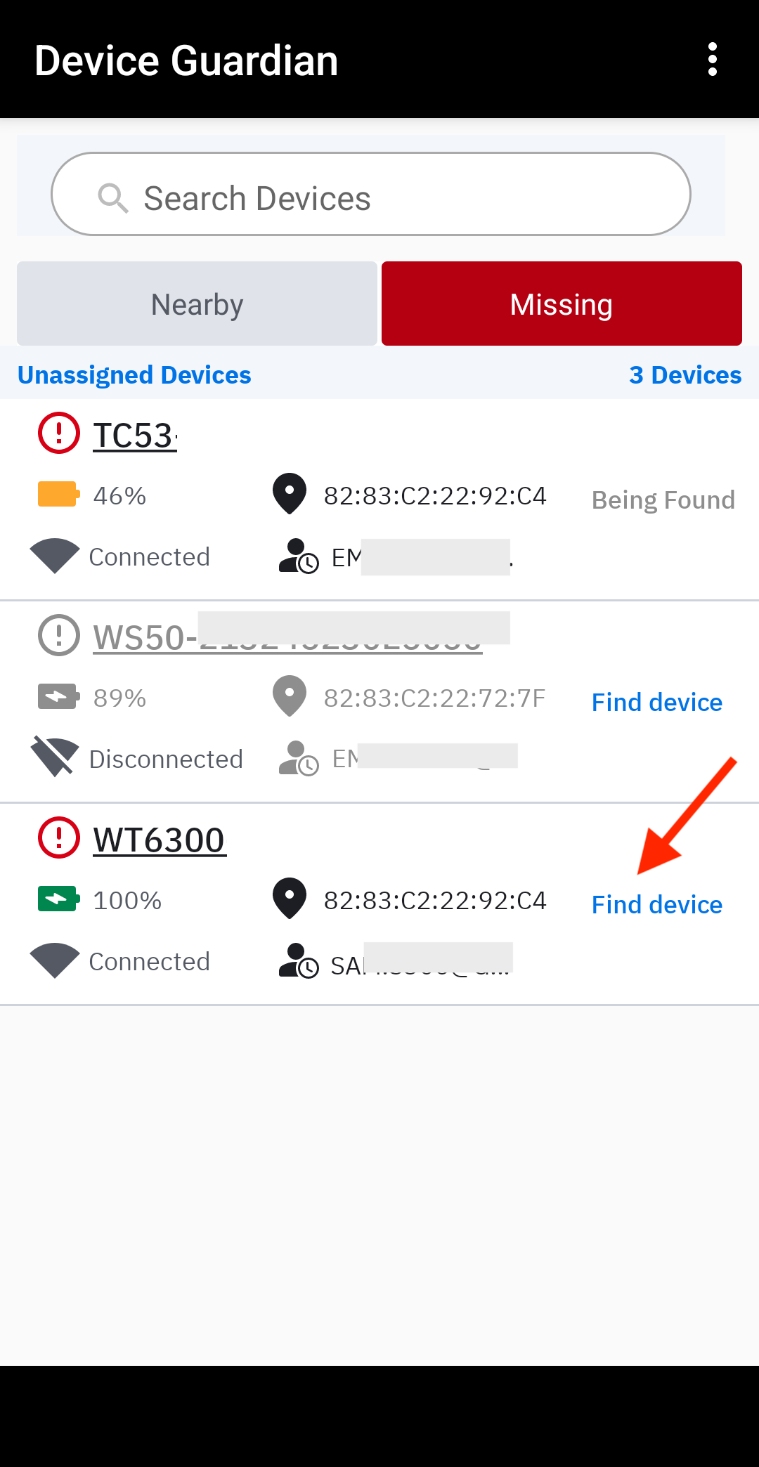 1. Initiate the device search: In the Missing tab screen, tap Find device for the selected device. image