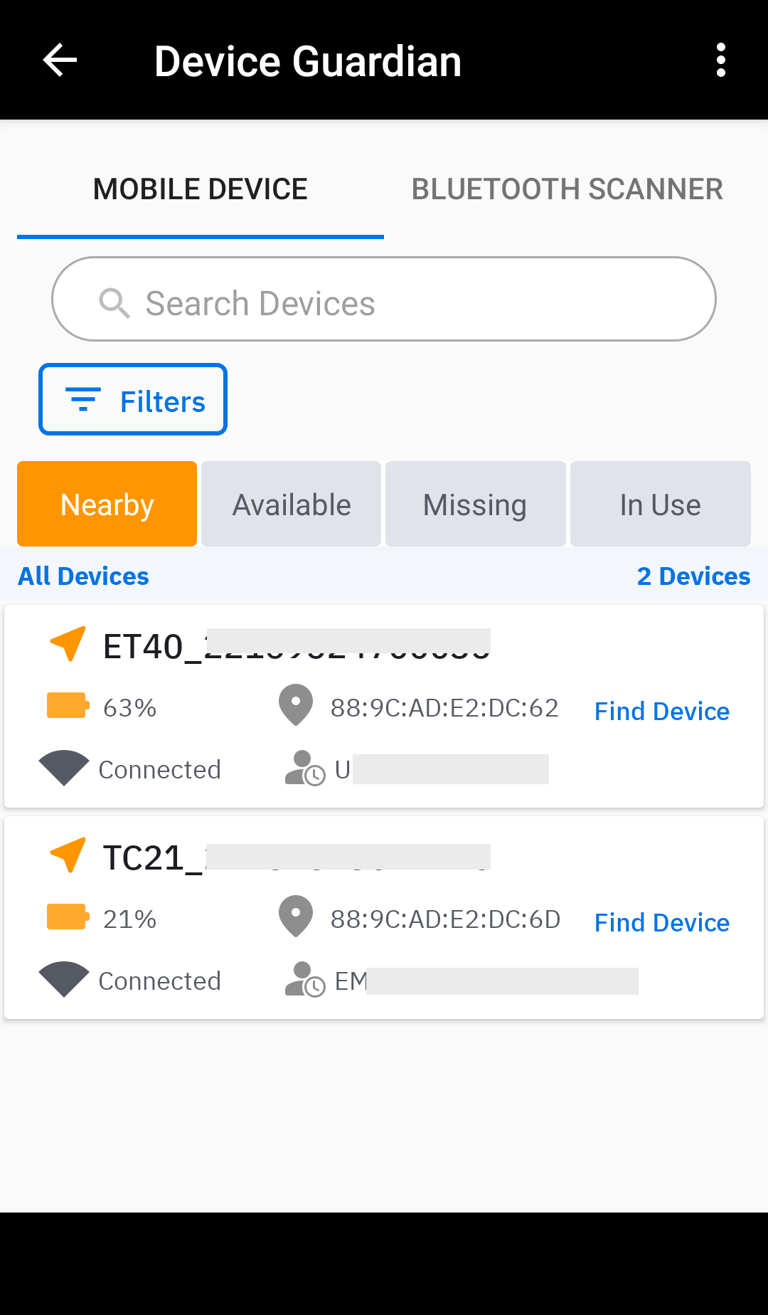• Located nearby - The Lost Devices Nearby notifications setting must be enabled in the web portal. When a Bluetooth scanner is set Missing (To Be Found) and Bluetooth beaconing is enabled on the Bluetooth scanner, the Nearby tab in the Missing screen displays the Bluetooth scanners that are detected to be in close proximity to the mobile computer.