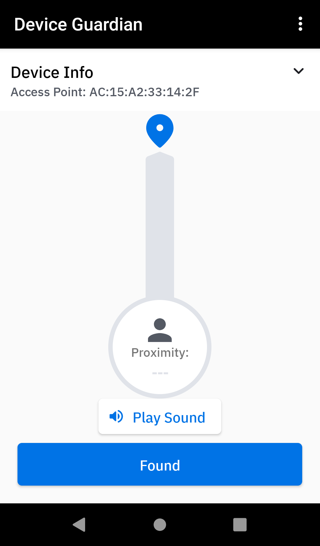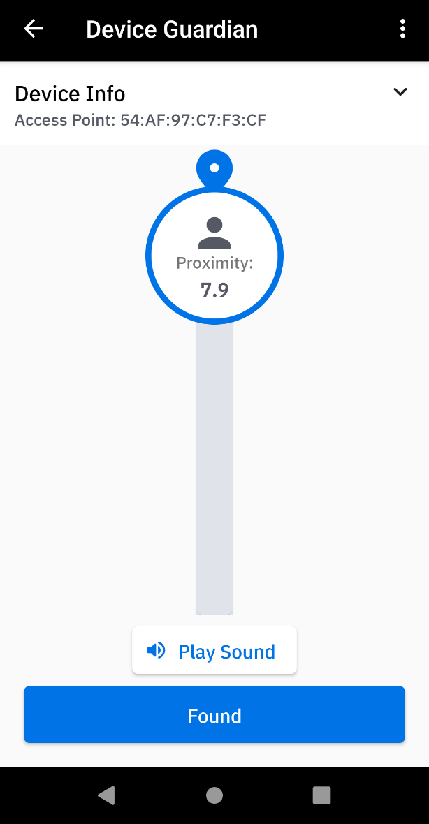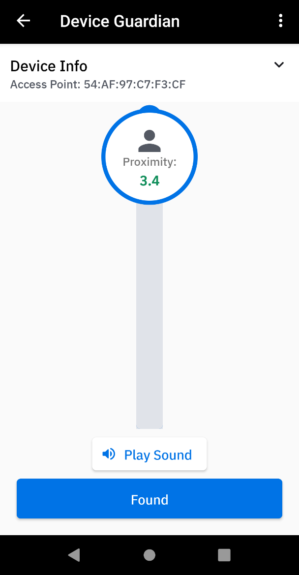 2. Locate the access point (AP): The device state changes to Being Found and the BLE proximity meter appears, showing the access point the device is connected to. Move towards the AP to approach the general area of the missing device.