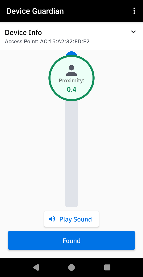 • Primary Method - This standard feature, available on all devices, uses the integrated Bluetooth radio to emit BLE beacons when the device is enrolled with the Device Guardian server and marked as lost, provided it is not in low battery or powered off. It leverages access point location, a Bluetooth-based visual proximity indicator, and a sound alert feature for effective tracking.
