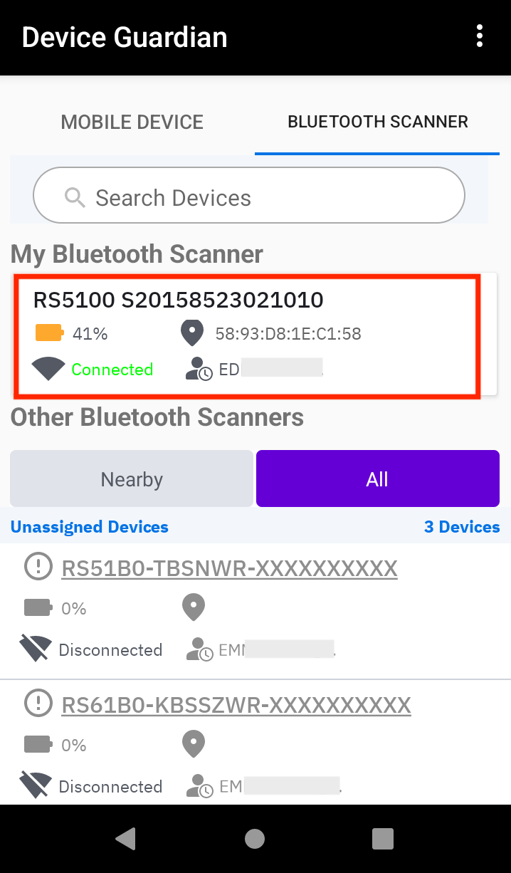 4. In Device Guardian mobile app, tap the Bluetooth Scanner tab in the To Be Found screen. My Bluetooth Scanner displays the paired and connected Bluetooth scanner. image