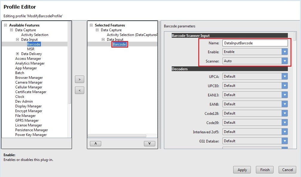 Provide name to Barcode Scanner Input so as to modify it programmatically (Ex: DataInputBarcode). Enable the feature and change some parameters.