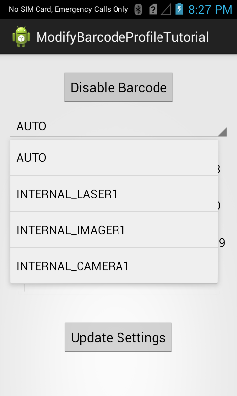 } catch (Exception ex) { resultString = ex.getMessage(); Toast.makeText(MainActivity.this, resultString, Toast.LENGTH_SHORT) .show(); } }// Create the ProfileConfig object profileConfigObj = new ProfileConfig(); // Get the ProfileConfig from the profile XML EMDKResults results = profileManager.processProfile(profileName, ProfileManager.PROFILE_FLAG.GET, profileConfigObj); // Check the return status of processProfile if (results.statusCode == EMDKResults.STATUS_CODE.FAILURE) { Toast.makeText(MainActivity.this, "Failed to get Profile", Toast.LENGTH_SHORT).show(); return; } // Set the code128 if (checkBoxCode128.isChecked()) { profileConfigObj.dataCapture.barcode.decoders.code128 = ENABLED_STATE.TRUE; } else { profileConfigObj.dataCapture.barcode.decoders.code128 = ENABLED_STATE.FALSE; } // set code39 if (checkBoxCode39.isChecked()) { profileConfigObj.dataCapture.barcode.decoders.code39 = ENABLED_STATE.TRUE; } else { profileConfigObj.dataCapture.barcode.decoders.code39 = ENABLED_STATE.FALSE; } // set EAN8 if (checkBoxEAN8.isChecked()) { profileConfigObj.dataCapture.barcode.decoders.ean8 = ENABLED_STATE.TRUE; } else { profileConfigObj.dataCapture.barcode.decoders.ean8 = ENABLED_STATE.FALSE; } // set ENA13 if (checkBoxEAN13.isChecked()) { profileConfigObj.dataCapture.barcode.decoders.ean13 = ENABLED_STATE.TRUE; } else { profileConfigObj.dataCapture.barcode.decoders.ean13 = ENABLED_STATE.FALSE; } // set upca if (checkBoxUPCA.isChecked()) { profileConfigObj.dataCapture.barcode.decoders.upca = ENABLED_STATE.TRUE; } else { profileConfigObj.dataCapture.barcode.decoders.upca = ENABLED_STATE.FALSE; } // set upce0 if (checkBoxUPCE0.isChecked()) { profileConfigObj.dataCapture.barcode.decoders.upce0 = ENABLED_STATE.TRUE; } else { profileConfigObj.dataCapture.barcode.decoders.upce0 = ENABLED_STATE.FALSE; } // Call processPrfoile with profile name, SET flag and config data // to update the profile results = profileManager.processProfile(profileName, ProfileManager.PROFILE_FLAG.SET, profileConfigObj); // Check the return status of processProfile if (results.statusCode == EMDKResults.STATUS_CODE.SUCCESS) { Toast.makeText(MainActivity.this, "Profile successfully updated", Toast.LENGTH_SHORT) .show(); } else { Toast.makeText(MainActivity.this, "Profile update failed", Toast.LENGTH_SHORT).show(); }So the updateProfile method looks like: