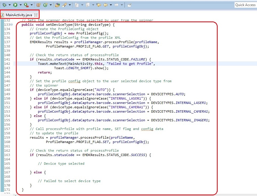 // Sets the scanner device type selected by user from the spinner public void setDeviceType(String deviceType) { // Create the ProfileConfig object profileConfigObj = new ProfileConfig(); // Get the ProfileConfig from the profile XML EMDKResults results = profileManager.processProfile(profileName, ProfileManager.PROFILE_FLAG.GET, profileConfigObj); // Check the return status of processProfile if (results.statusCode == EMDKResults.STATUS_CODE.FAILURE) { Toast.makeText(MainActivity.this, "Failed to get Profile", Toast.LENGTH_SHORT).show(); return; } // Set the profile config object to the user selected device type from // the spinner if (deviceType.equalsIgnoreCase("AUTO")) { profileConfigObj.dataCapture.barcode.scannerSelection = DEVICETYPES.AUTO; } else if (deviceType.equalsIgnoreCase("INTERNAL_LASER1")) { profileConfigObj.dataCapture.barcode.scannerSelection = DEVICETYPES.INTERNAL_LASER1; } else if (deviceType.equalsIgnoreCase("INTERNAL_CAMERA1")) { profileConfigObj.dataCapture.barcode.scannerSelection = DEVICETYPES.INTERNAL_CAMERA1; } else { profileConfigObj.dataCapture.barcode.scannerSelection = DEVICETYPES.INTERNAL_IMAGER1; } // Call processPrfoile with profile name, SET flag and config data // to update the profile results = profileManager.processProfile(profileName, ProfileManager.PROFILE_FLAG.SET, profileConfigObj); // Check the return status of processProfile if (results.statusCode == EMDKResults.STATUS_CODE.SUCCESS) {