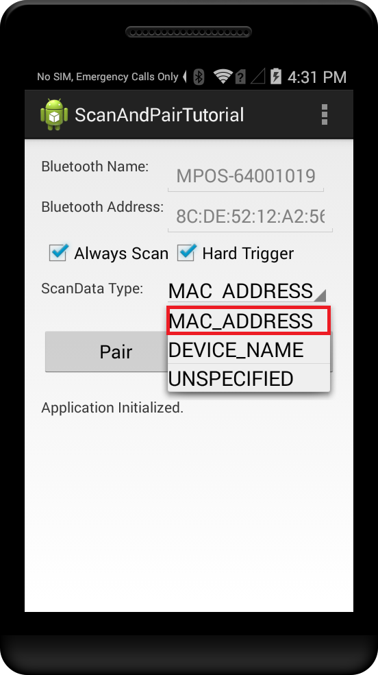 4. We would scan the Bluetooth Address of Remote Scanning device. So select MAC ADDRESS option from "ScanData Type" spinner.