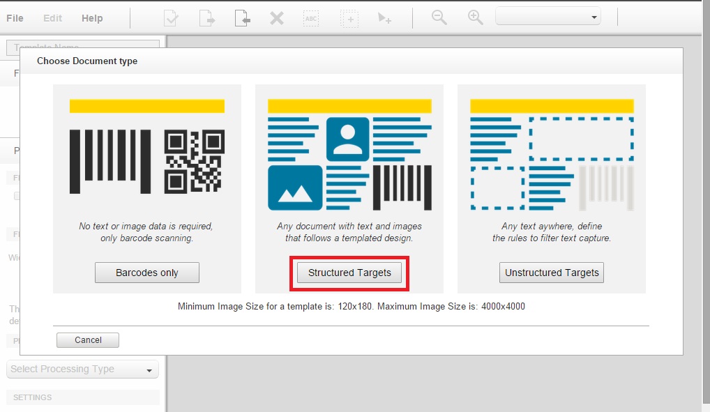 3. You could see different document types based on your needs. Since we already have a document format that contains barcodes and characters, click "Structured Targets" button.