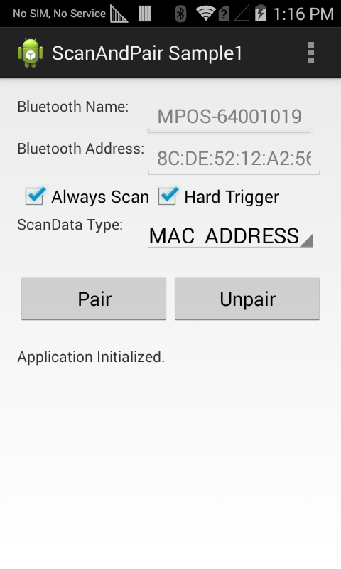 1. When the application starts it should look like the following. Leave the Always Scan and Hard Trigger check boxes selected, and insure the ScanData Type spinner is set to MAC ADDRESS.