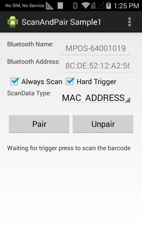 3. Now place the Pairing Barcode in view of the devices scan window, and then press the devices Hard Scan Trigger. The Scan and Pair sample app will retrieve MAC address from the barcode and place it in the Bluetooth Address field, then it will initiate the pairing and connection process. Press Pair in the Pairing Request dialog, to complete the pairing process. After pairing is complete, the status label will display "Bluetooth device is paired successfully".