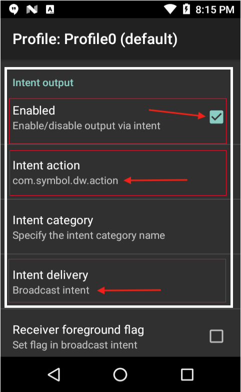 com.symbol.dw.actionand Tap OK. - Tap Intent delivery and select (or confirm) “Broadcast Intent” and Tap OK.