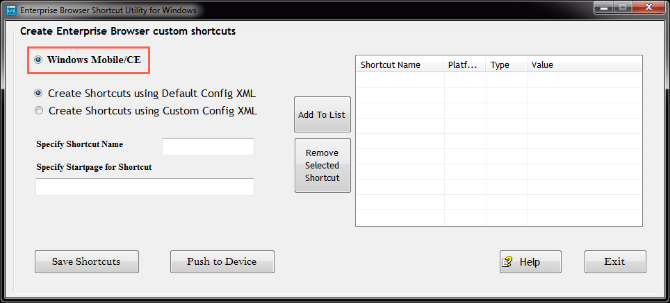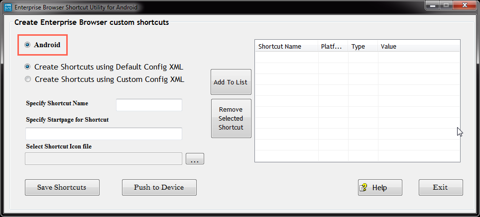 - Select the platform (Android or Windows Mobile/CE) to be targeted by the shortcut and launch the corresponding utility.