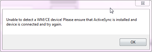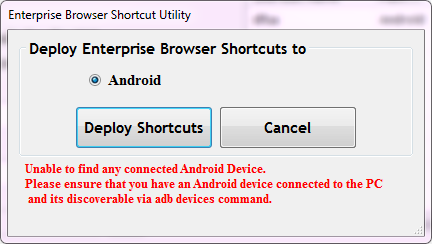 The Shortcut Creator communicates with Android devices via ADB (USB only) and with Windows Mobile/CE devices through Mobile Device Center (or ActiveSync on WinXP) over USB or Bluetooth. If you're seeing a message like the one below or having other communication-related issues, please refer to the Connections section of the Enterprise Browser installation guide.
