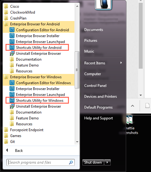 To begin, launch the target-specific "Shortcuts Utility" from the corresponding Enterprise Browser folder of the Windows Start Menu, as below: